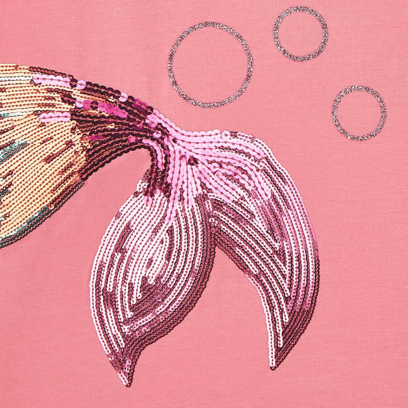 Mayoral Girls Summer Sundress. Featuring a coral-colored fabric with an enchanting mermaid print and an eye-catching sequin tail detail.