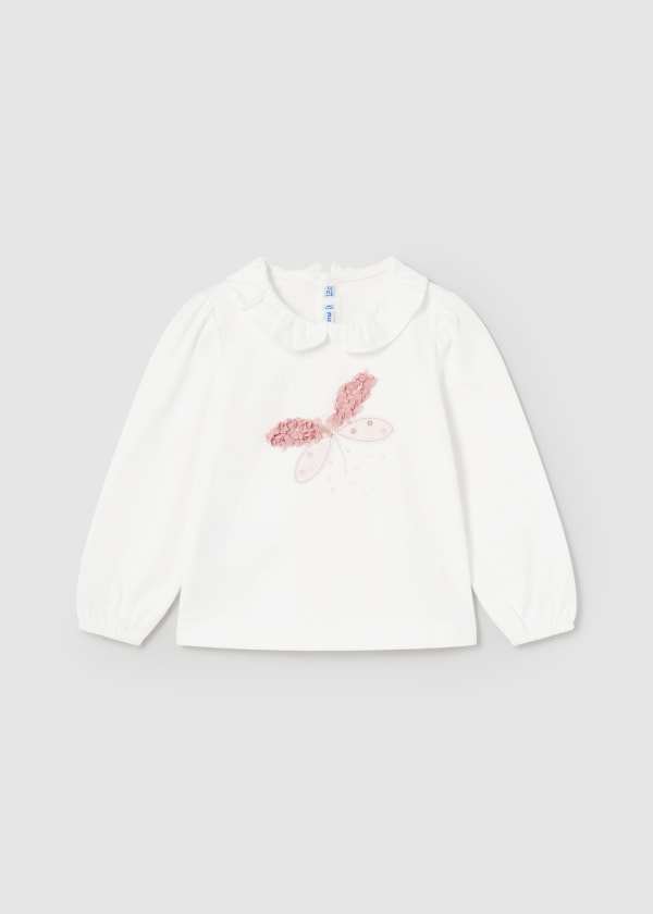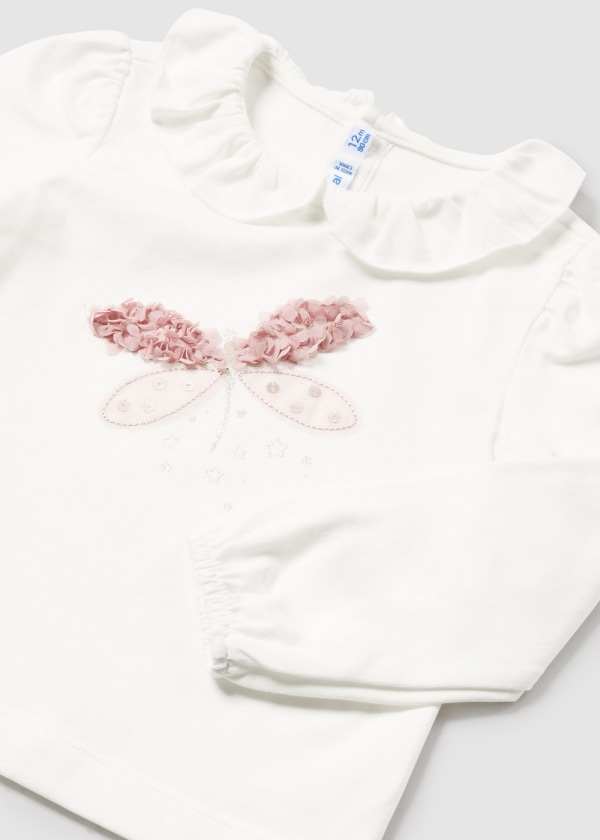 Bodysuit with long sleeves for newborn with ruffles on the shoulders. Snap-button fastening on the back to allow the garment to be put on easily. Snap button fastening at crotch for easy dressing.