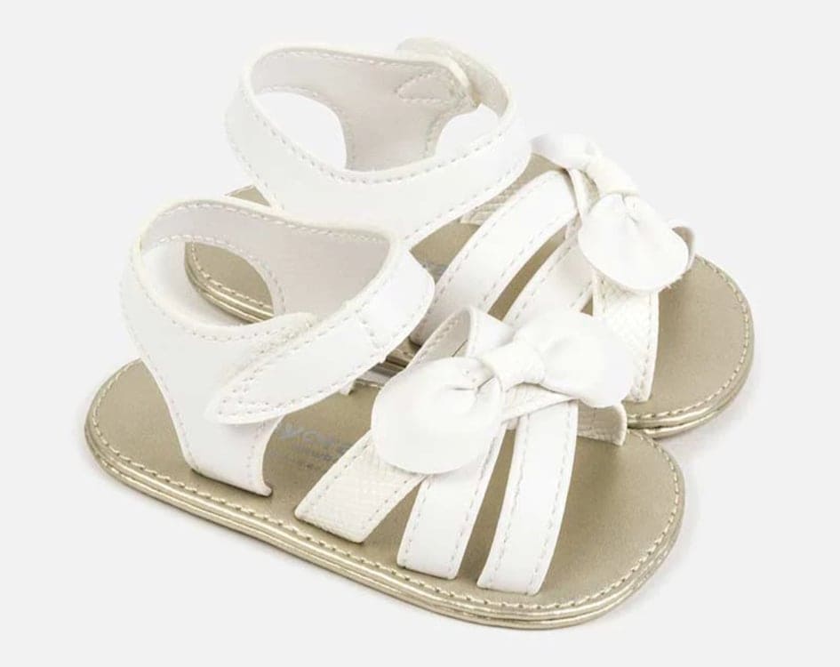 Summer sandals for newborn baby girl to wear on hot days. Leather effect outer material. Adjustable velcro strap which guarantees a perfect fit. Decorative elements: bow applique.