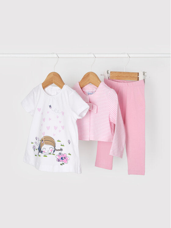 This Mayoral Three Piece Leggings Set is perfect for your baby girl's wardrobe. Featuring a pink colorway, this summer look has a bow accent that adds a delightful touch. With a timeless design, this set is an on-trend choice.