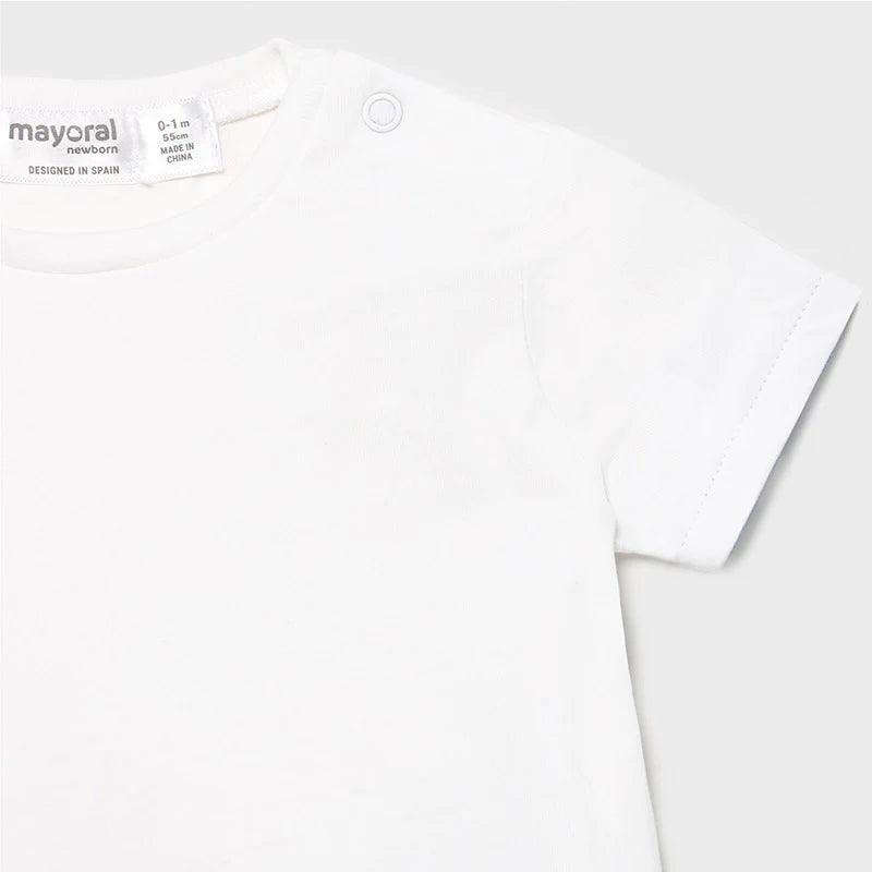 Short sleeved T-shirt for newborn. Round neckline. Snap buttons fastenings on the shoulder.
