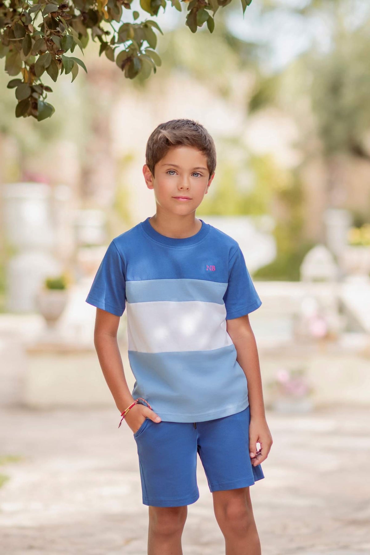 Miranda Boys Shorts and T-shirt Set! Perfect for summer, this blue and white outfit is sure to make your little boy look stylish and feel comfortable all day long.