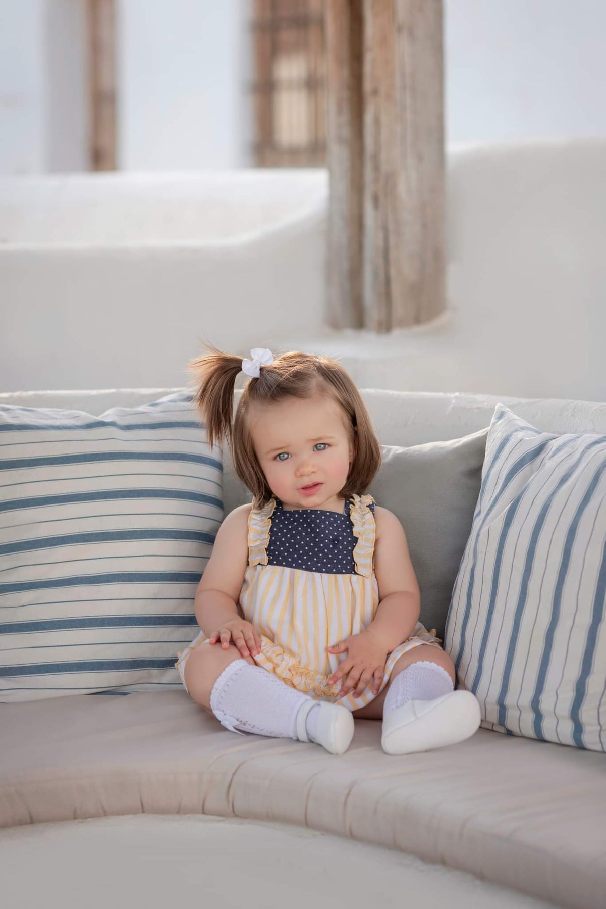 Miranda Yellow & Navy dress and pants set! The sleeveless dress features a stylish ruffled design and the navy pants are adorned with a delicate yellow stripe.