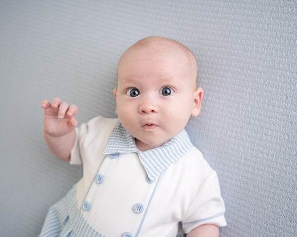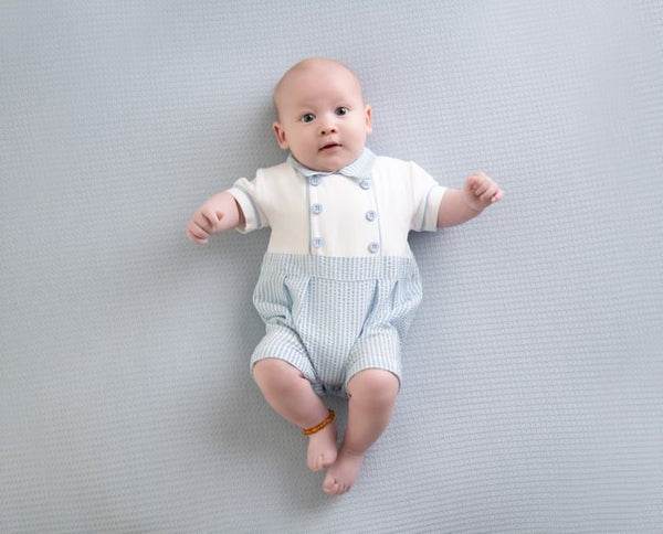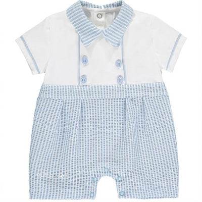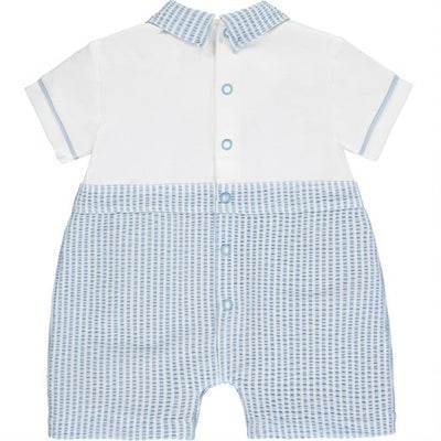 This classic, collared seersucker shortie romper by Mini Mitch - the perfect choice for all your important special occasions. Crafted in a lightweight and breathable cotton-blend and finished in a beautiful blue and white colourway. Popper buttons make dressing him easy!