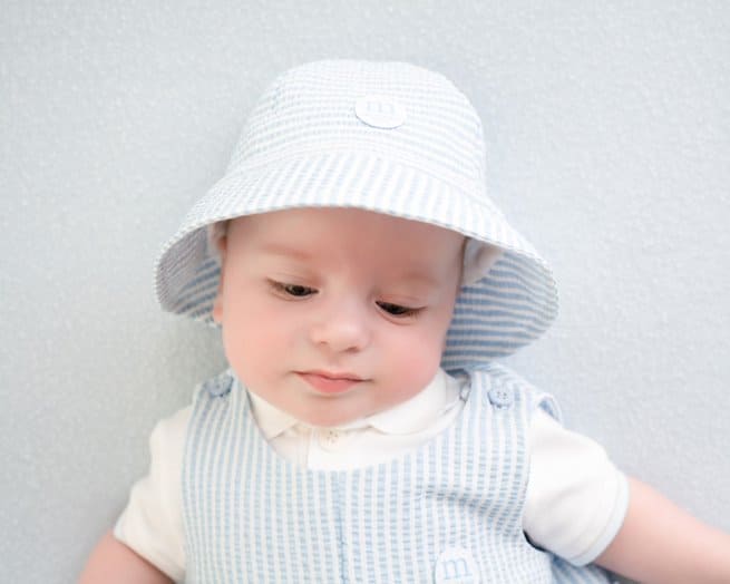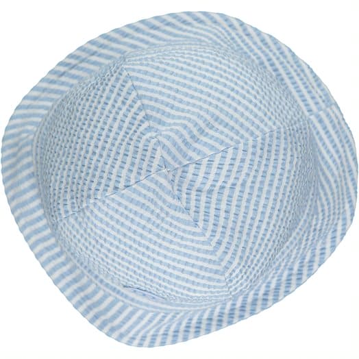 Stay stylish and sun-safe with the Mitch & Son Baby Blue & White Seersucker Sunhat - DARIUS. Made from high-quality seersucker fabric, this sunhat not only provides protection but also adds a touch of sophistication to your child's outfit. Match it with our coordinating rompers for the ultimate summer look.