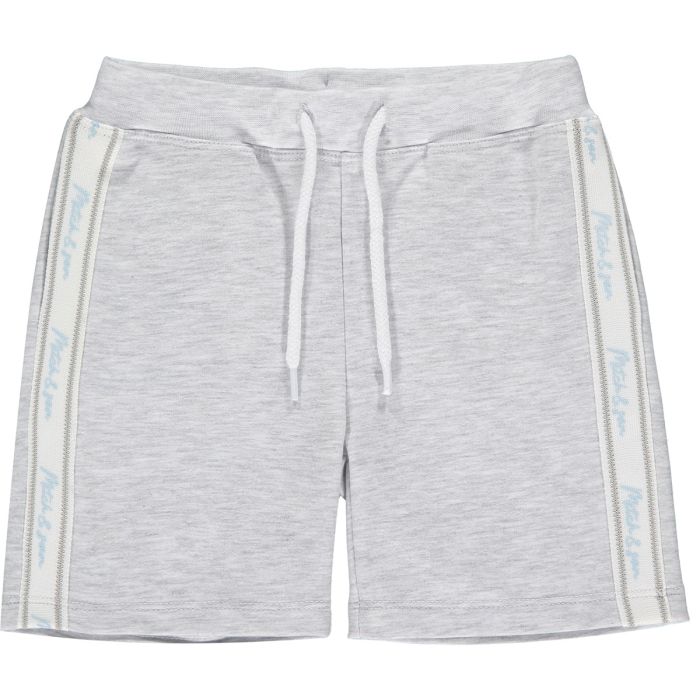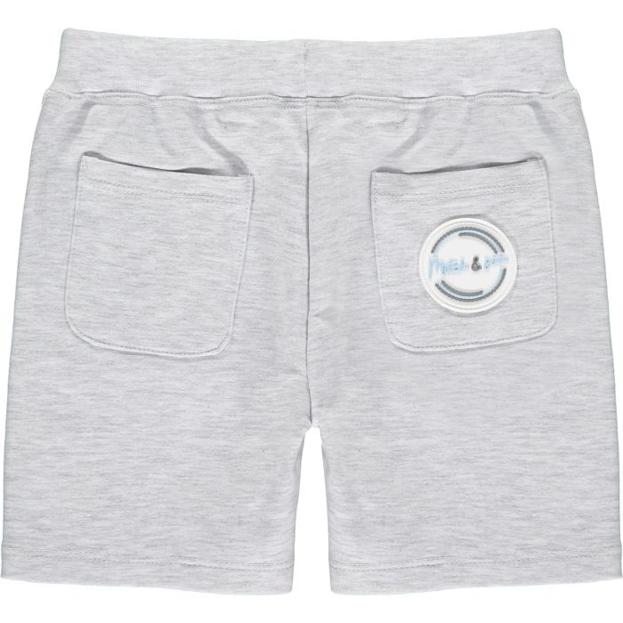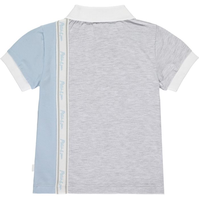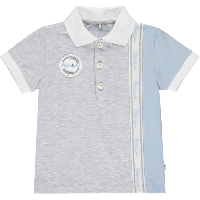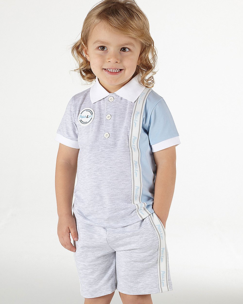 Mitch & Son Alby Boys Grey Short Set. 2 piece set with Cotton jersey colour block polo top paired with matching sweat shorts. Signature tape detail on both. Finished with rubber logo badge on front of top and back pocket of shorts.