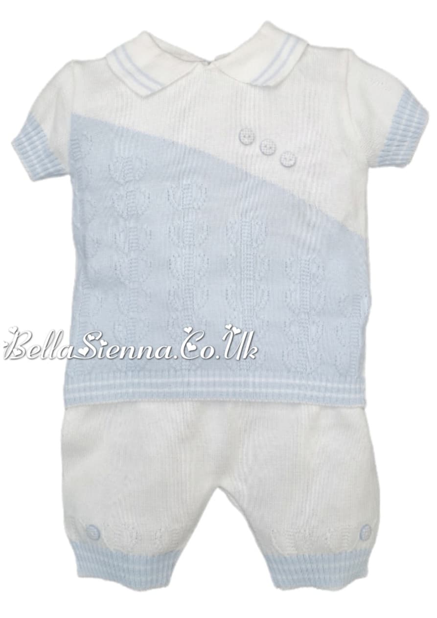 Pretty Originals Baby Boys 2 piece set a traditional short sleeve polo top with knitted collar and blue trim white polo top with ribbed sleeves and 3 buttons on the chest - pierced knit on the sleeves and front, comes with knitted shorts with ribbed elasticated waistband. A traditional style for boys.