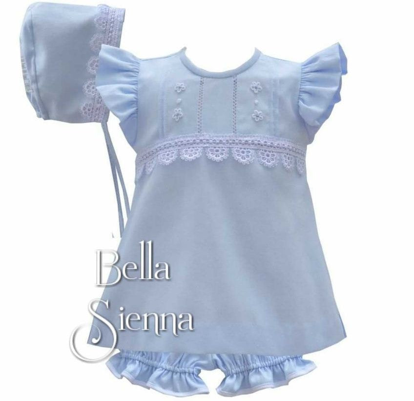 Pretty Originals Baby Girls Blue Dress, Pants & Bonnet Set With Lace Trim - BD01890