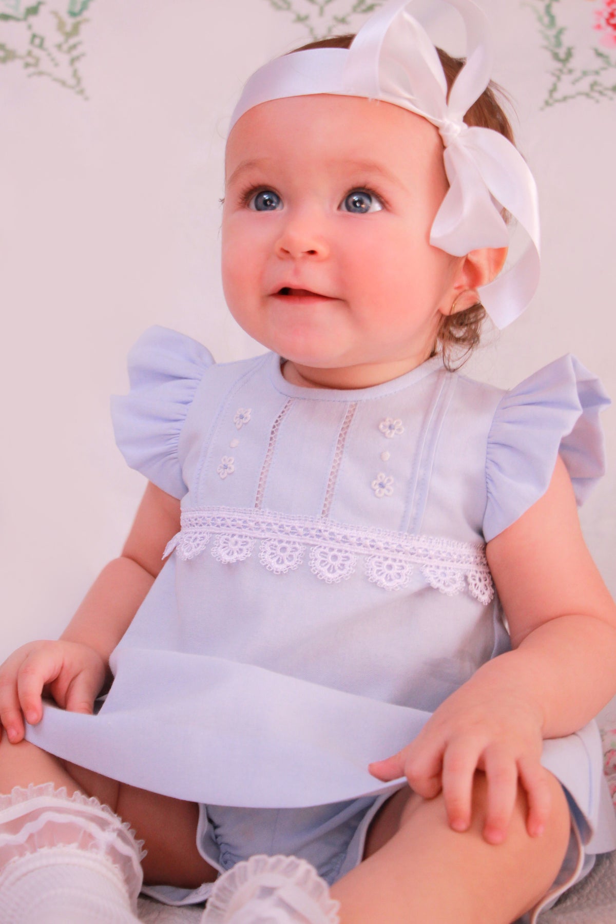 Baby girls blue dress with white lace trim by Pretty Originals, with the use of beautiful fabrics and intricate lace trims. The dress has hand-embroidered flowers on the front and fastens on the back with buttons. A matching lace-trimmed bonnet and knickers are also included.