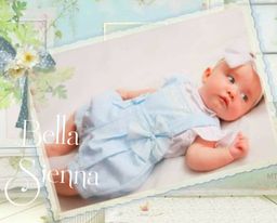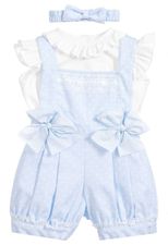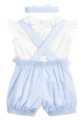 Little girls shorts and blouse set by Pretty Originals, with a matching headband. The white blouse a ruffle collar. It fastens with buttons on the back. The blue shorts have white spots and blue striped bows, and the adjustable straps fasten to the elasticated waist with buttons.