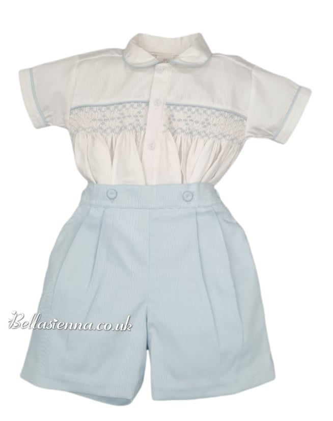 The set includes a crisp white cotton, short sleeve shirt trimmed in blue, complete with smart smocking, which fastens at the front with buttons and a classic pair of shorts. A great, all-in-one outfit for babies and young boys and is perfect for smarter summer occasions.