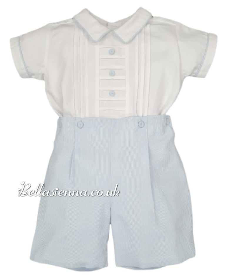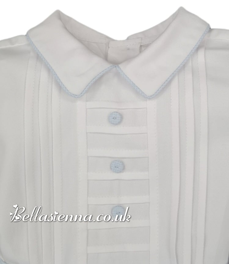 This stunning two-piece boys outfit by Pretty Originals will have your little prince looking his best. The white button-down shirt is trimmed with blue, and features decorative buttons down the front. The blue shorts attach to the shirt with fabric-covered buttons for a formal, charming look. Make the most of those special moments with this stylish ensemble.
