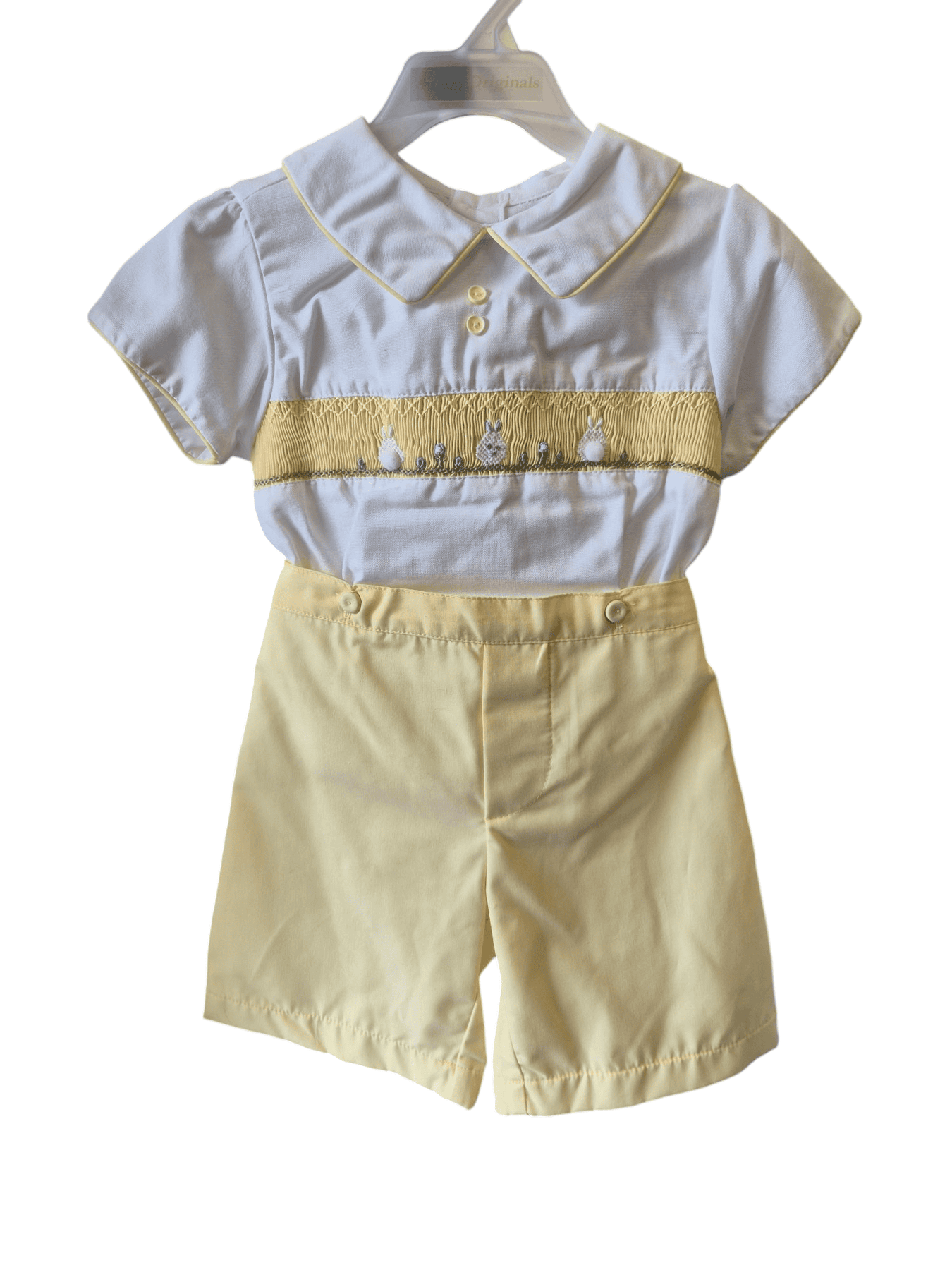 Pretty Originals Boys Smocked Easter Outfit - Lemon & White With Bunny Rabbits - MT02205