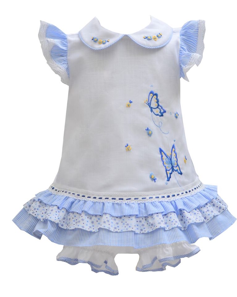 White and blue dress, headband and bloomer set for little girls by Pretty Originals, made in a mid-weight polycotton. There are hand-embroidered butterflies on the front and stripe trims on the capped sleeves. The bloomers also have frilly fine stripe trims. The set comes with a matching headband.