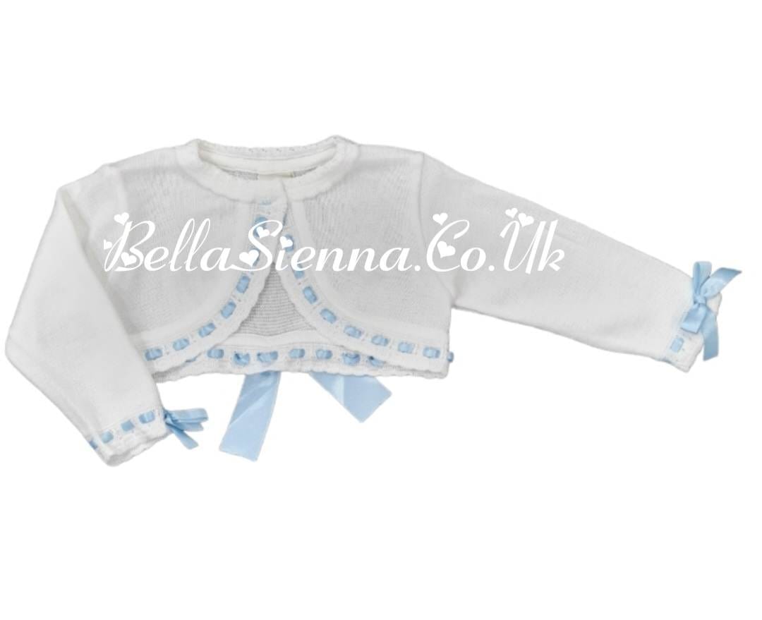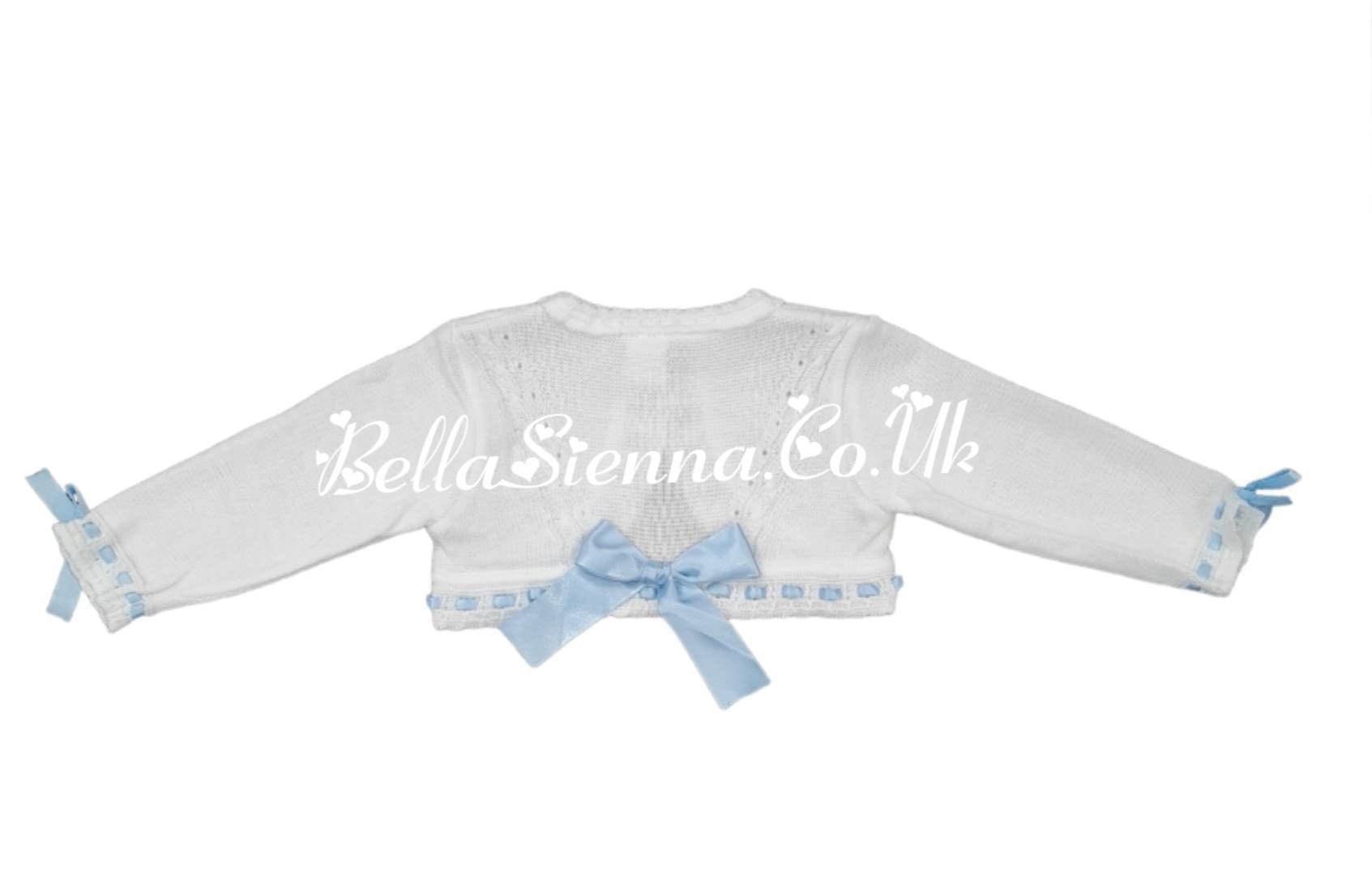 Gorgeous cardigan for girls, this white cardigan is from British designer Pretty Originals. Softly knitted, it has a blue satin ribbon running through the cuffs and around the front and back decorative bow stitched on the back. This scallop-edged piece fastens with a hidden button on the front.