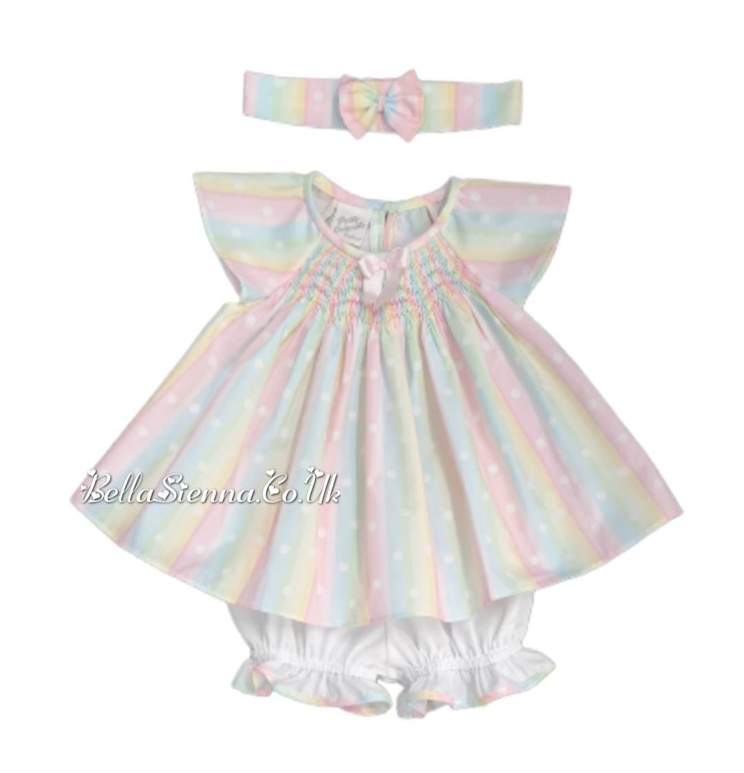 This Pretty Originals Hand Smocked Multicoloured Dress, Pants & Headband Set by Pretty Originals. The set includes a dress, pants, and a headband, each handmade with smocking details for added charm and style. Perfect for special occasions!