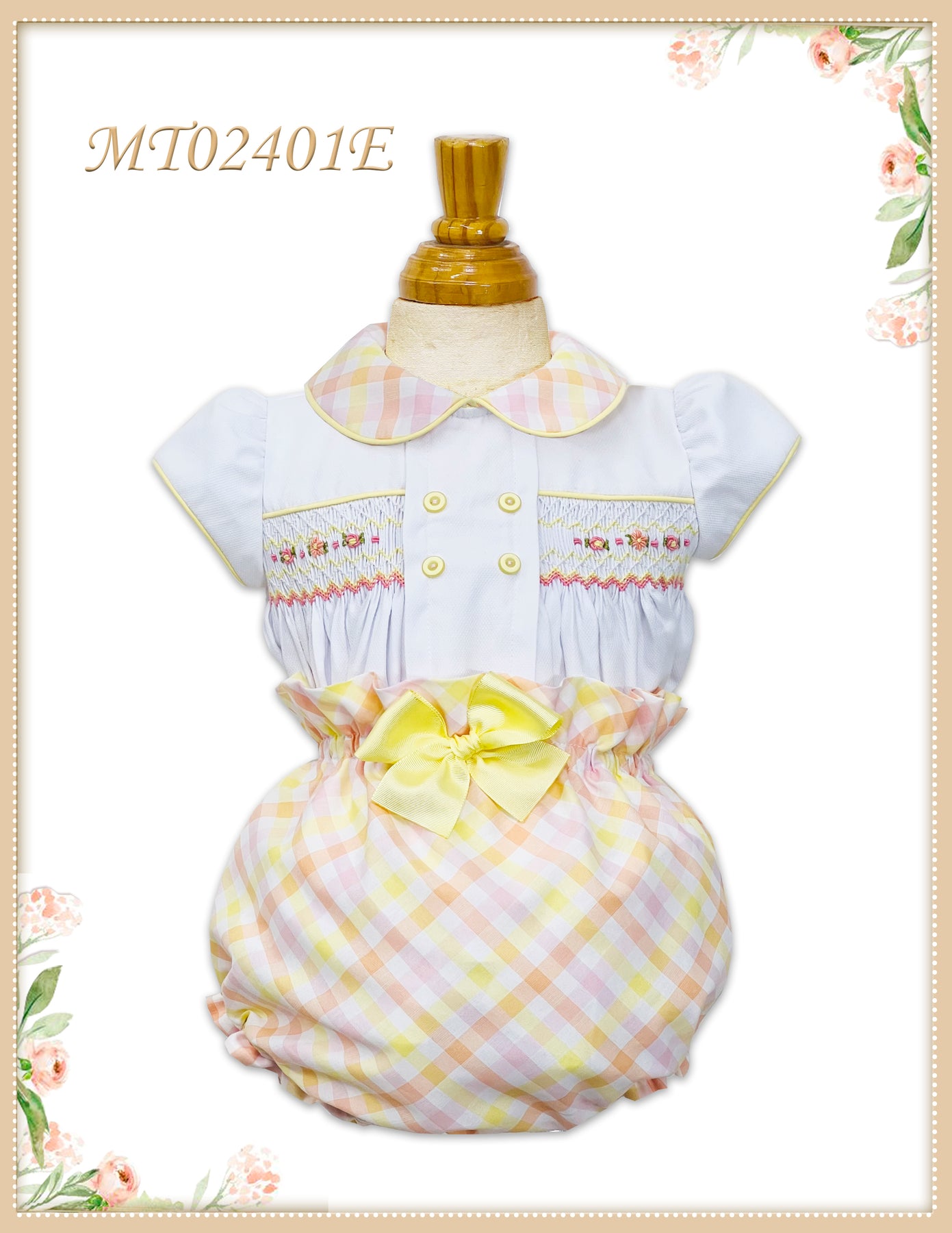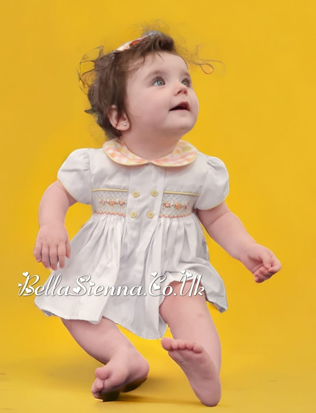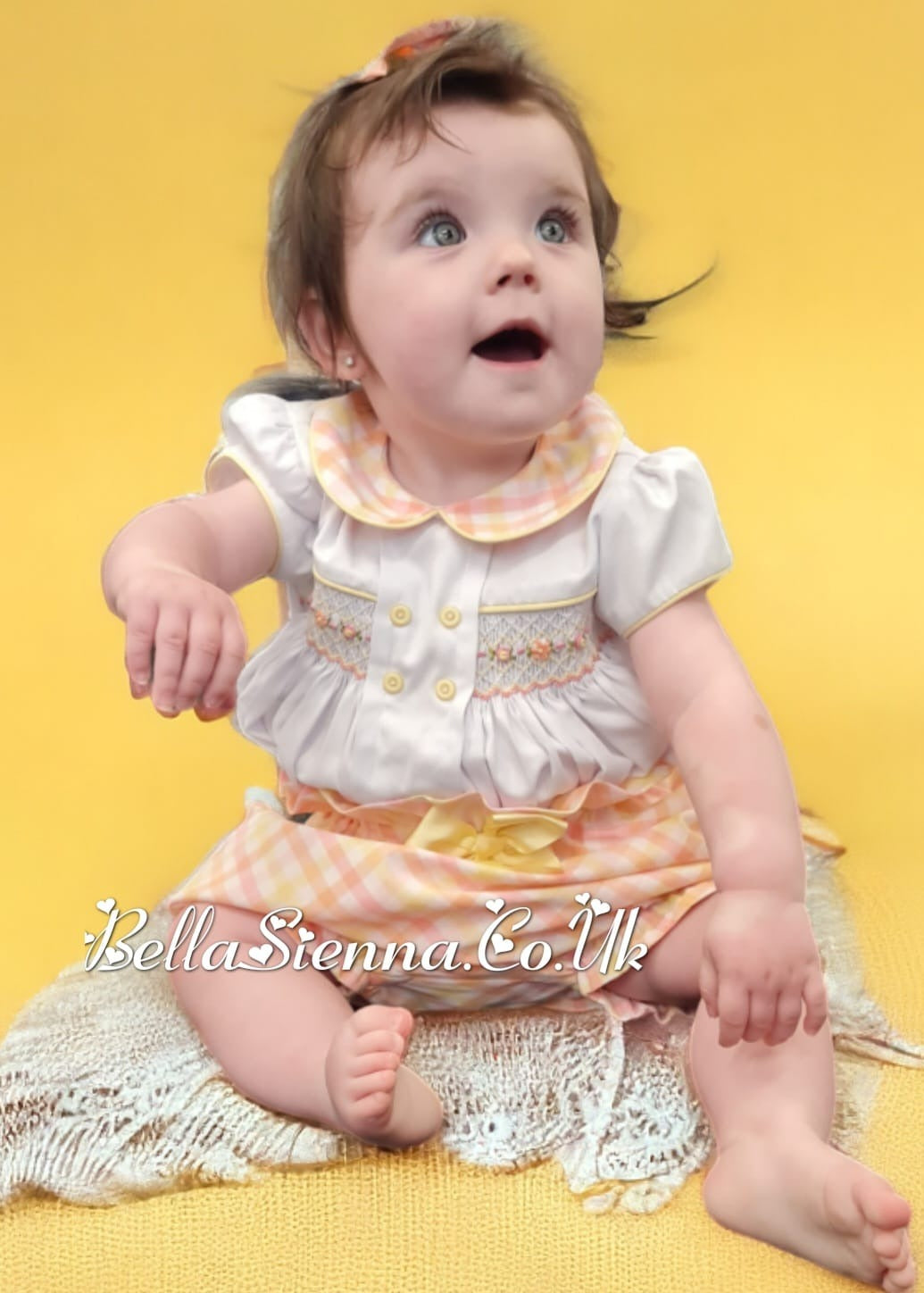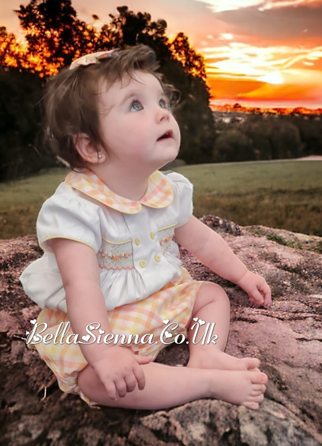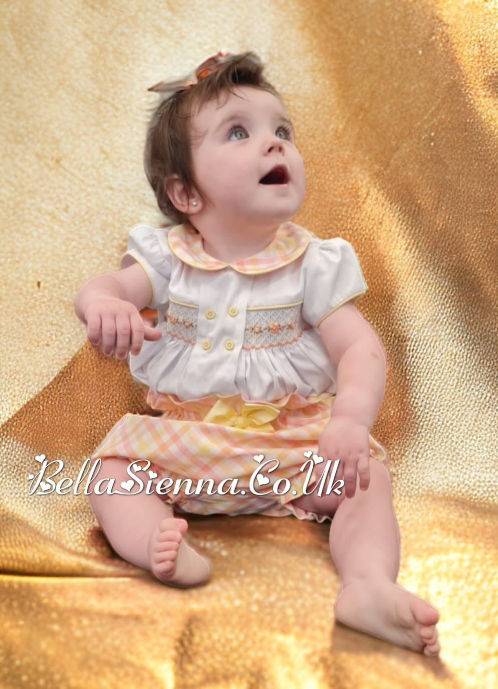 Pretty Originals Multicoloured Check Hand Smocked Outfit & Matching Hair Clip. Hand smocked with a beautiful check pattern, this outfit is perfect for any occasion. The matching hair clip adds a touch of charm.
