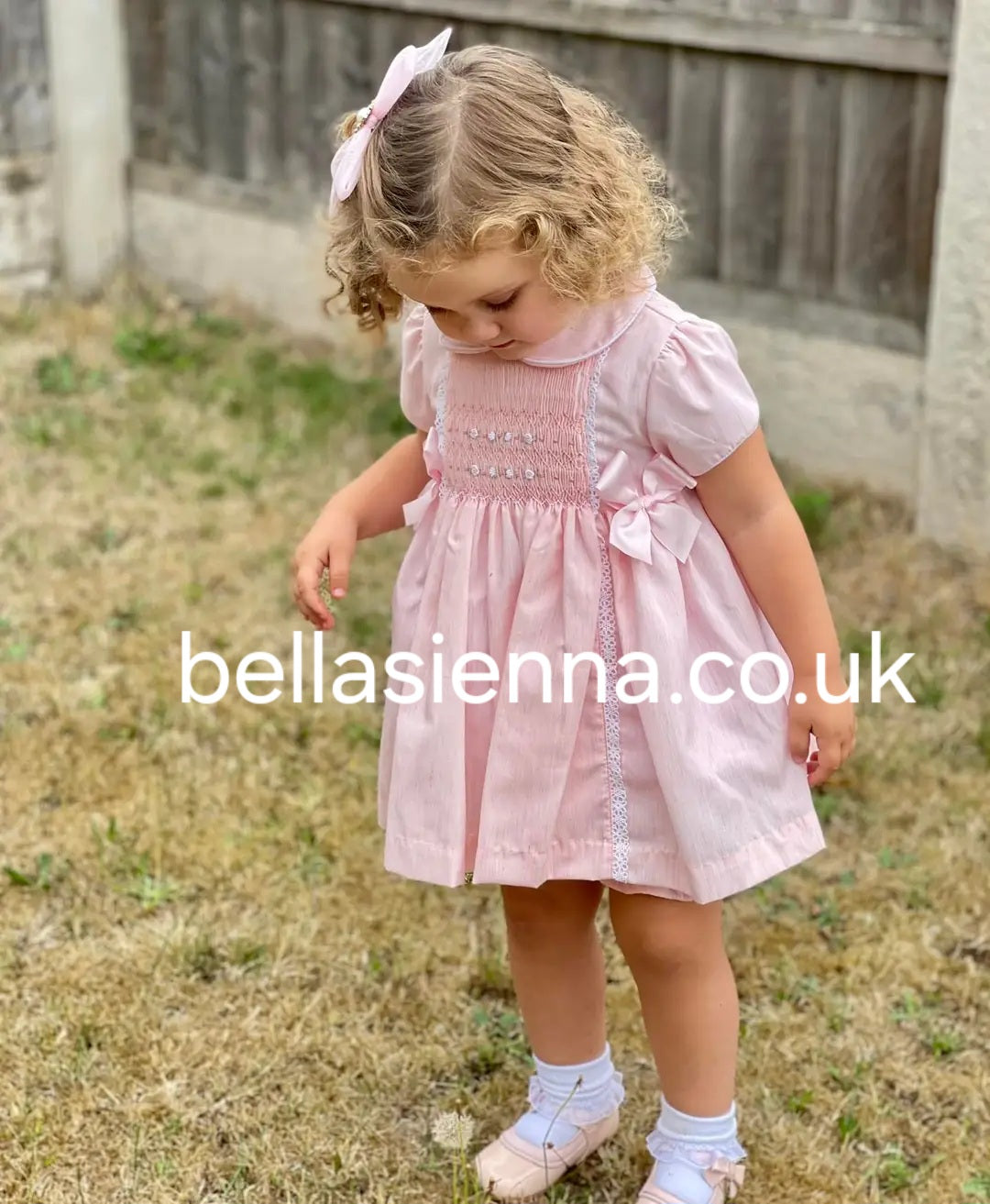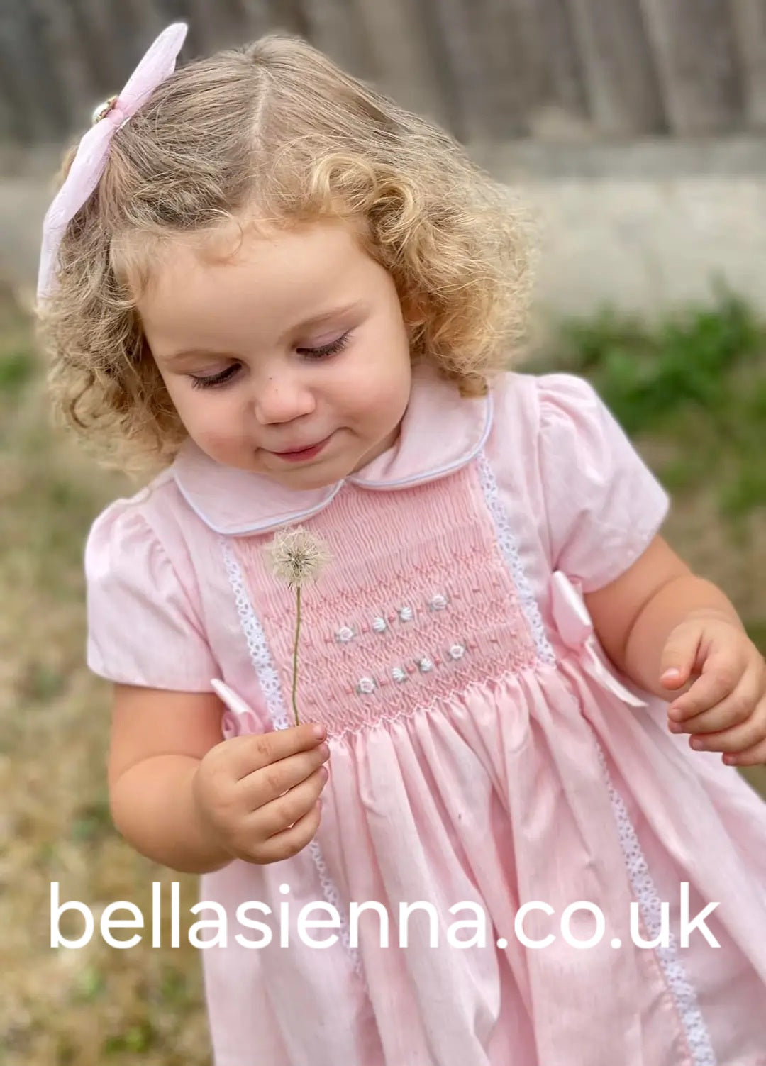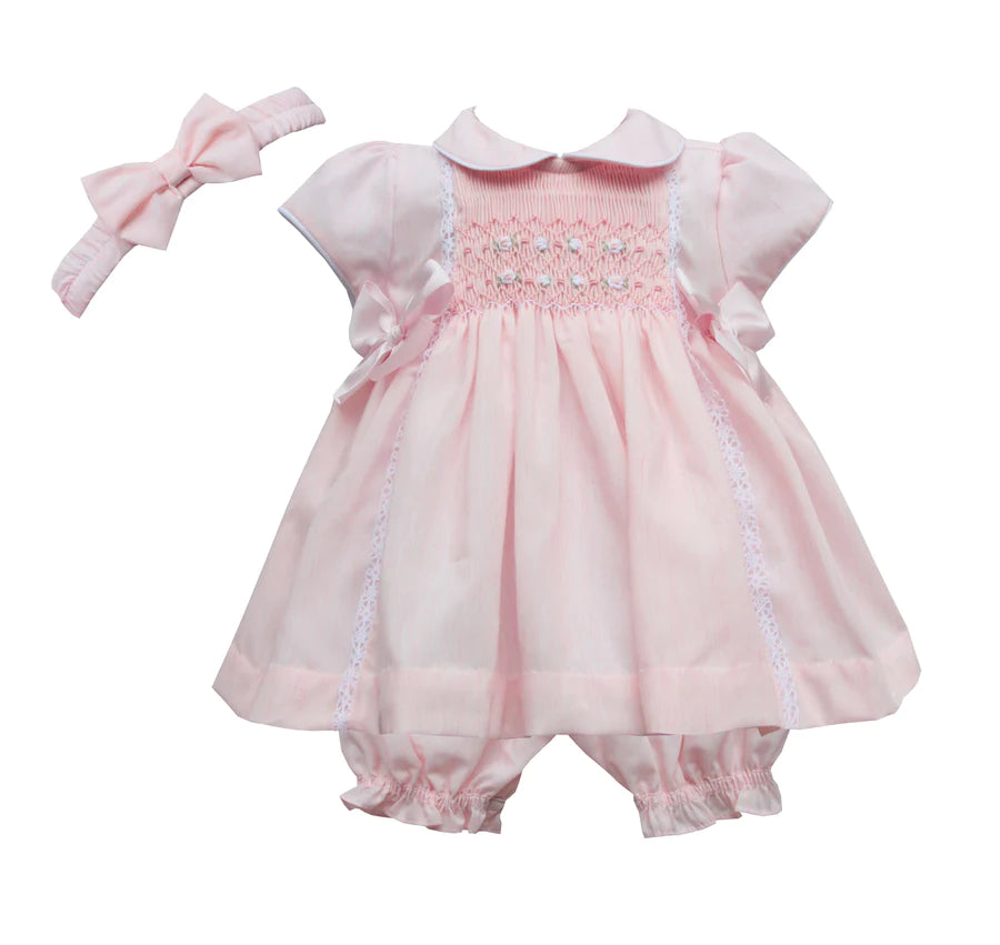 The Perfect Originals Smocked Dress, Bloomers & Headband is ideal for your little princess. It features an embroidered flower design, two pink bows, and a sash belt for a stunning look. The high-quality fabric a truly beautiful set .
