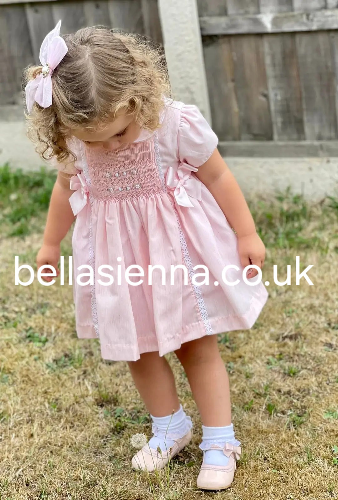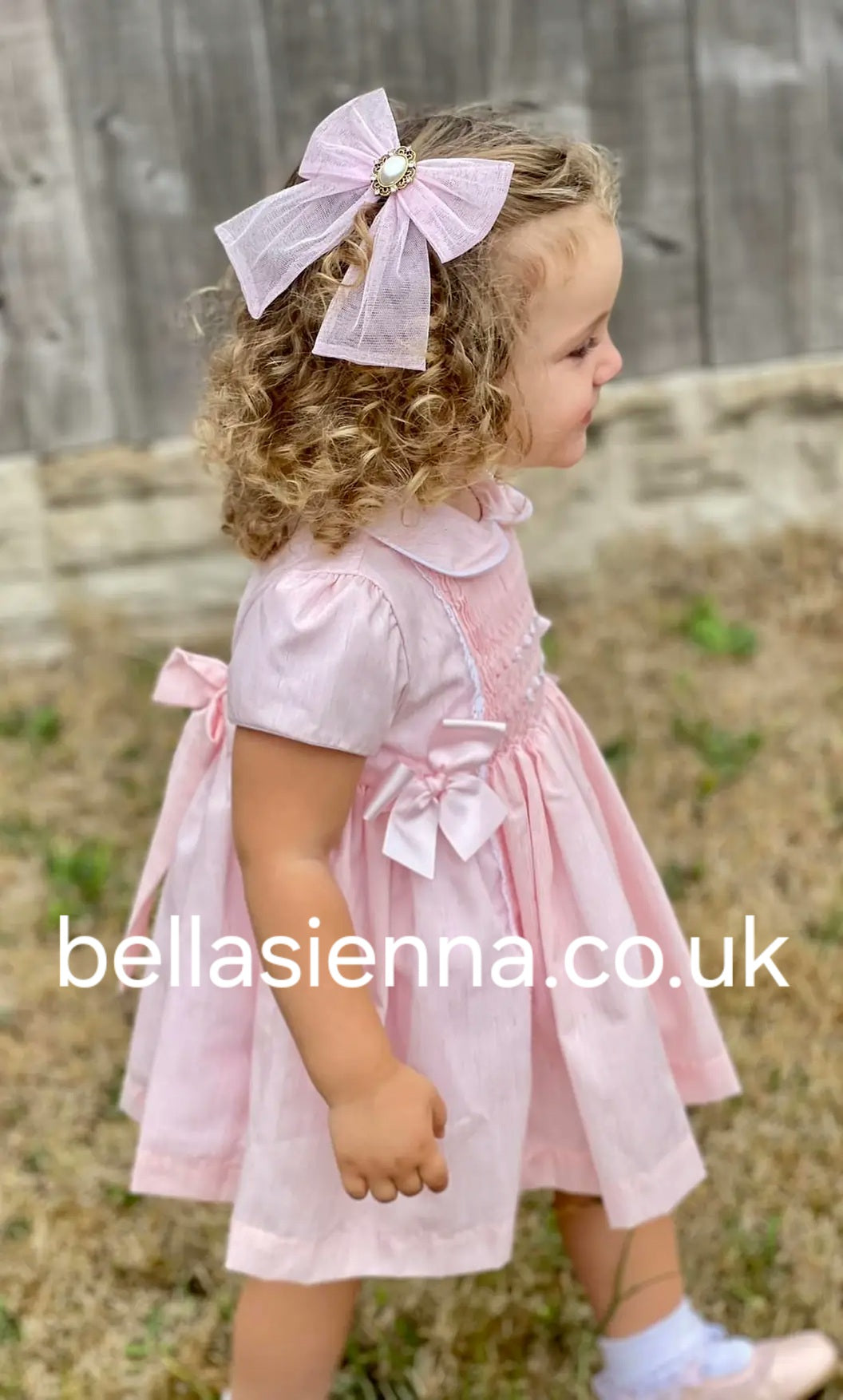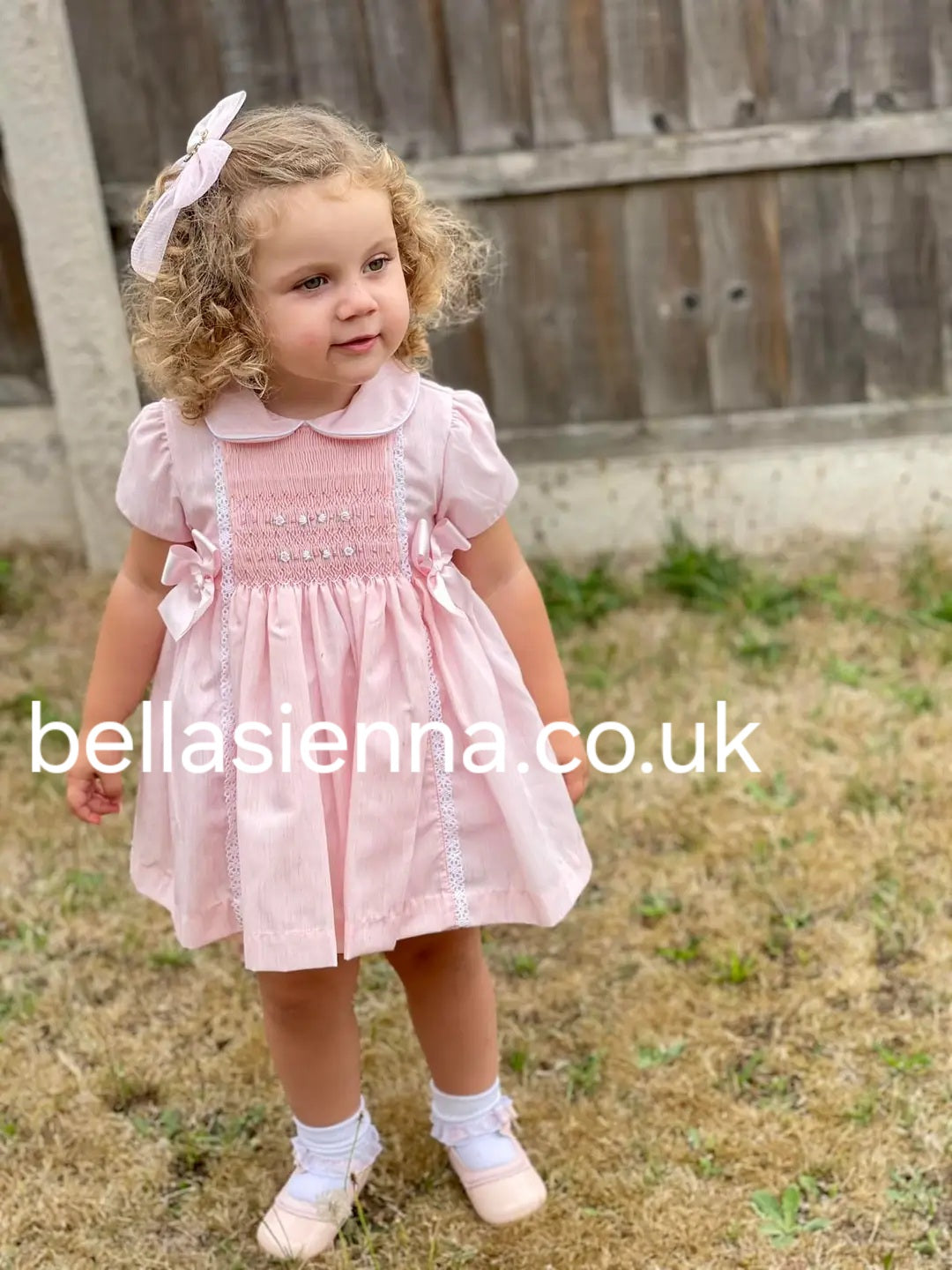 The Perfect Originals Smocked Dress, Bloomers & Headband is ideal for your little princess. It features an embroidered flower design, two pink bows, and a sash belt for a stunning look. The high-quality fabric a truly beautiful set .