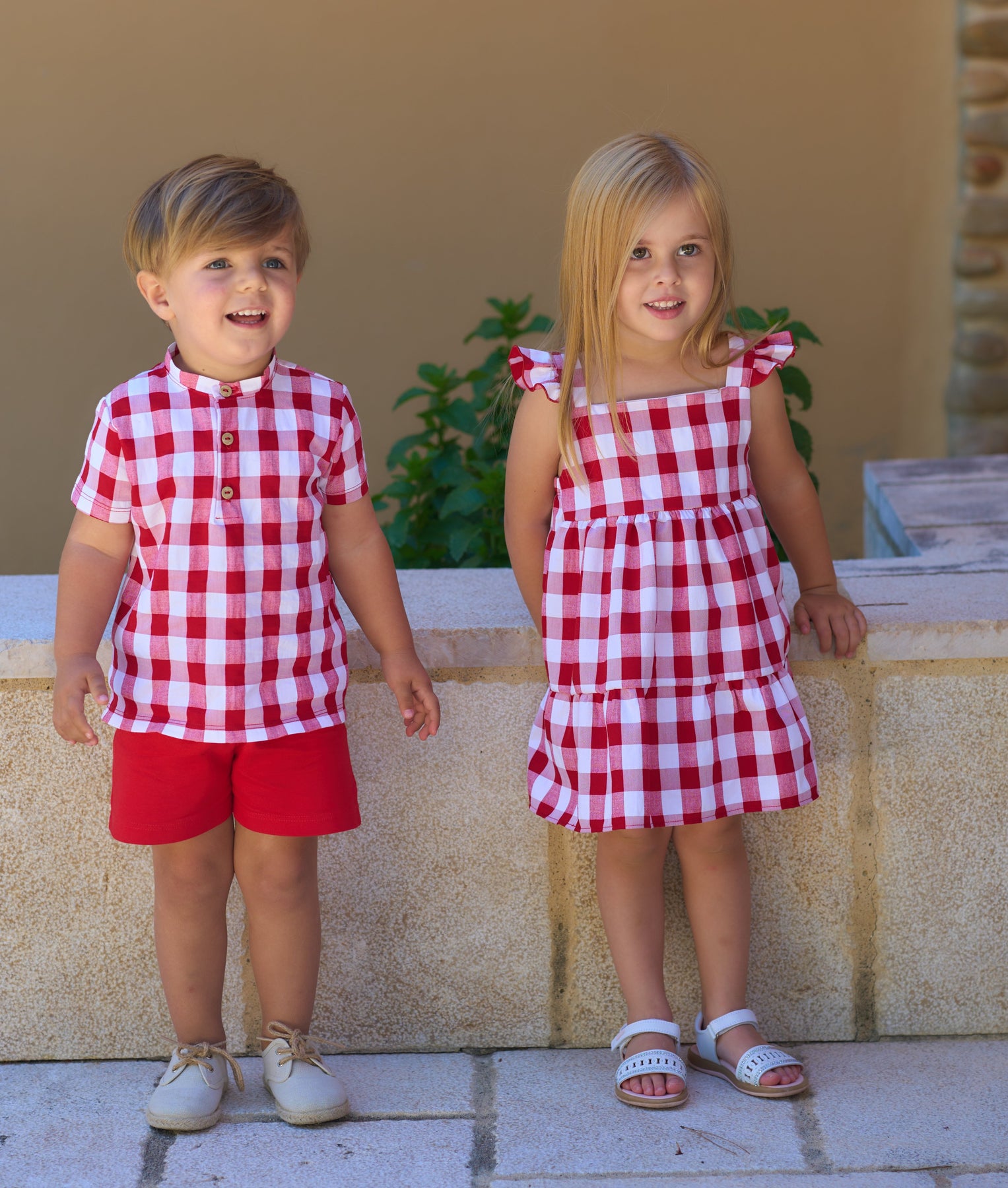 Rapife girls red and white check dress with cute frill detail and bow. The dress comes with matching knickers.