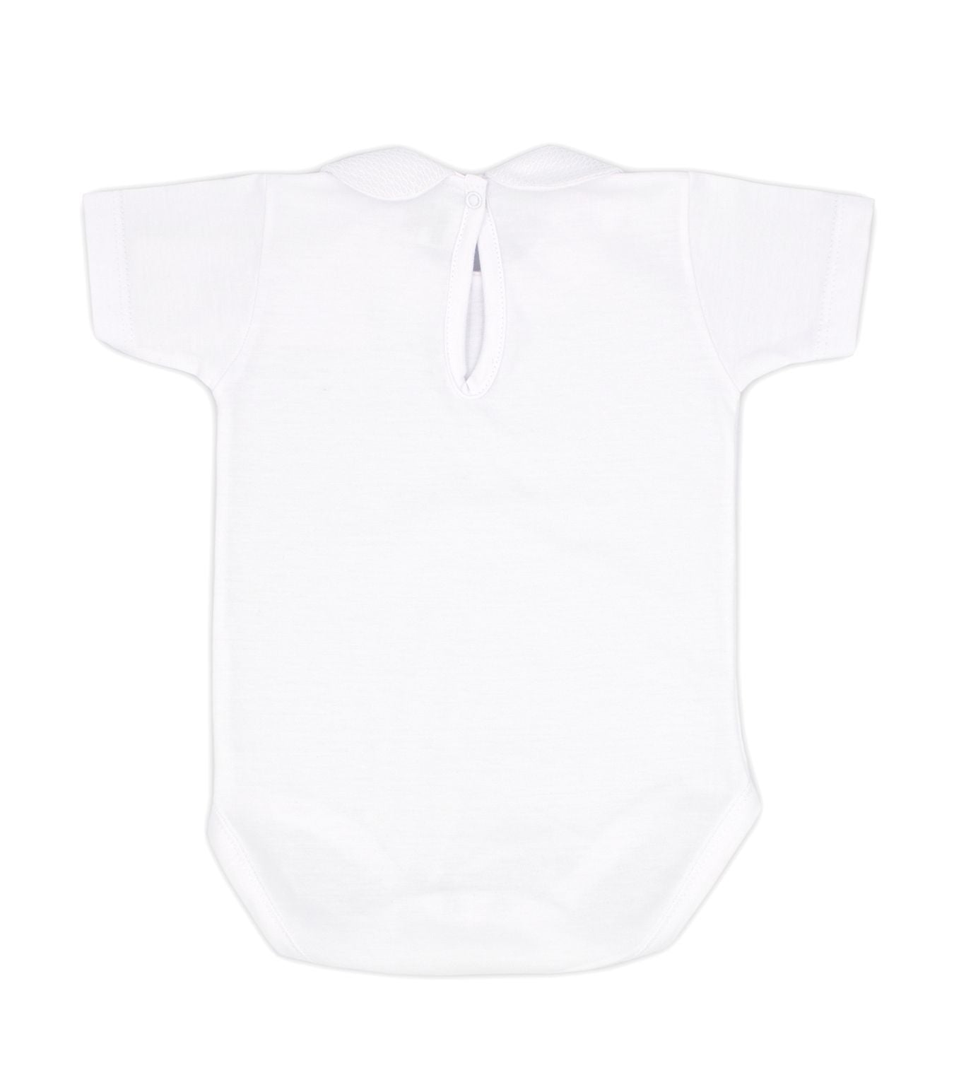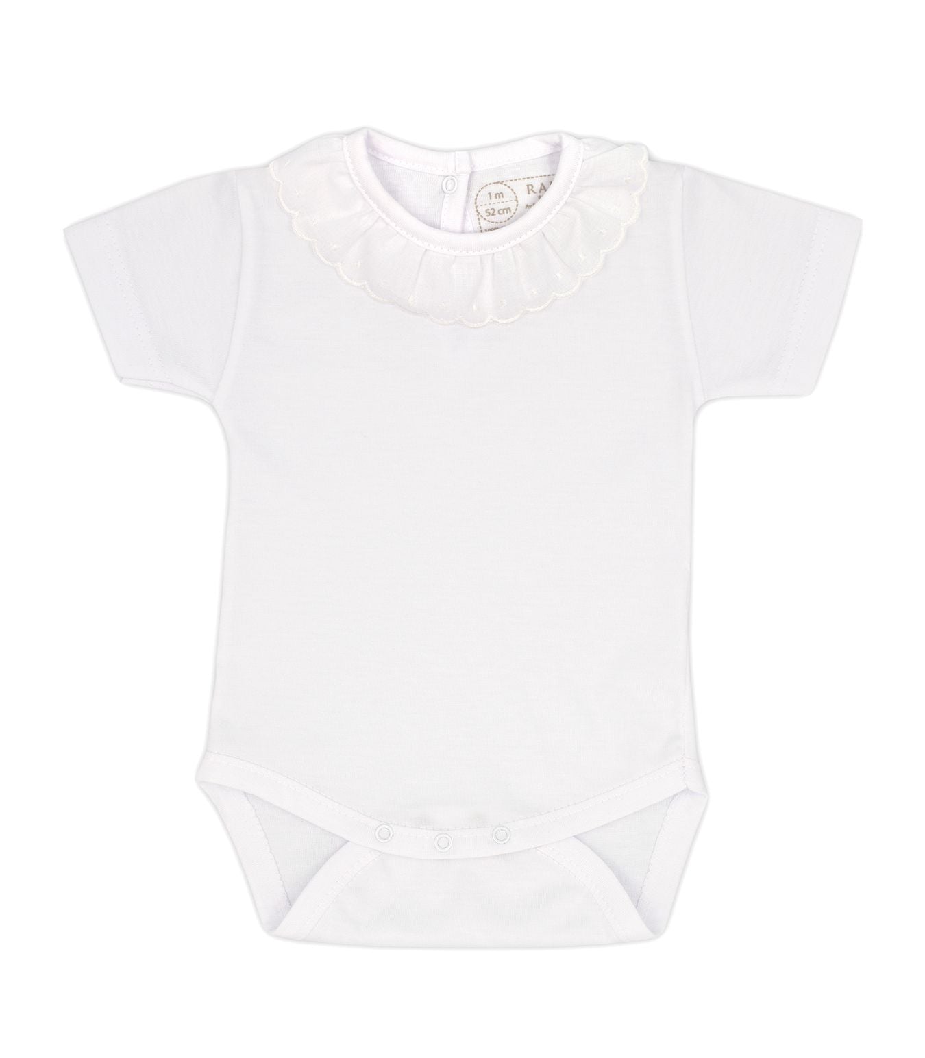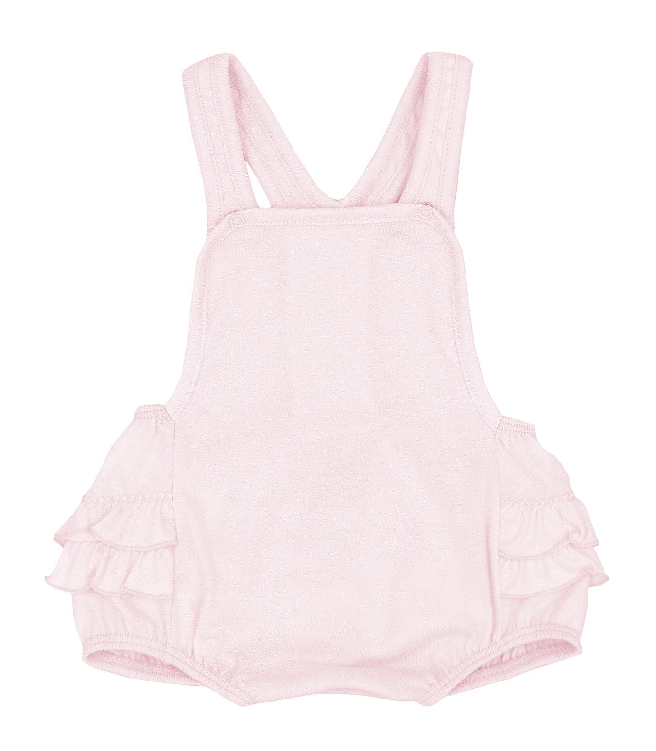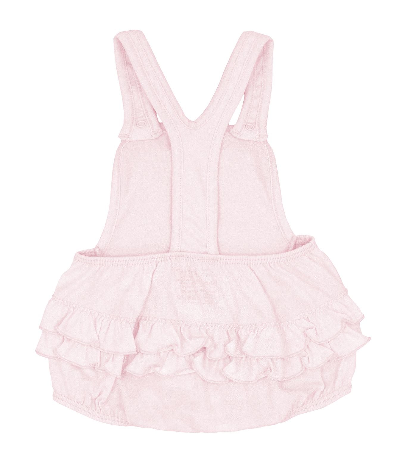 Rapife Girls Two Piece Dungaree Set. This set includes a white short-sleeved body suit with a scalloped ruffle collar and popper fastening for easy changing. The pink dungarees feature sweet ruffles on the bum and also have popper fastening. Make dressing your little one a breeze with this adorable, high-quality set.
