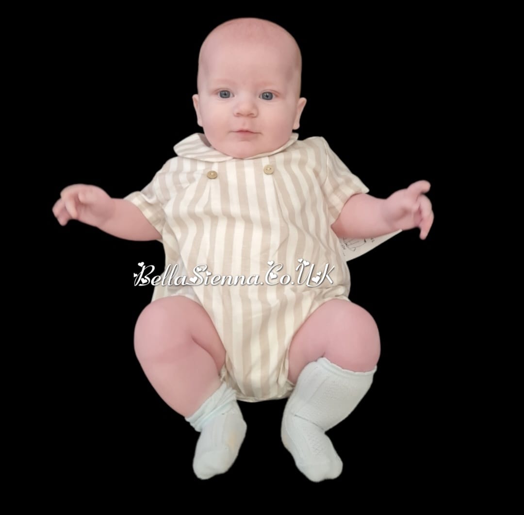 Ivory and beige cute little romper by Rapife. The romper is ivory with a beige stripe two little pleats on the chest finished off with sweet little wooden buttons peter pan collar detail. Popper fastening on back and the inside leg.