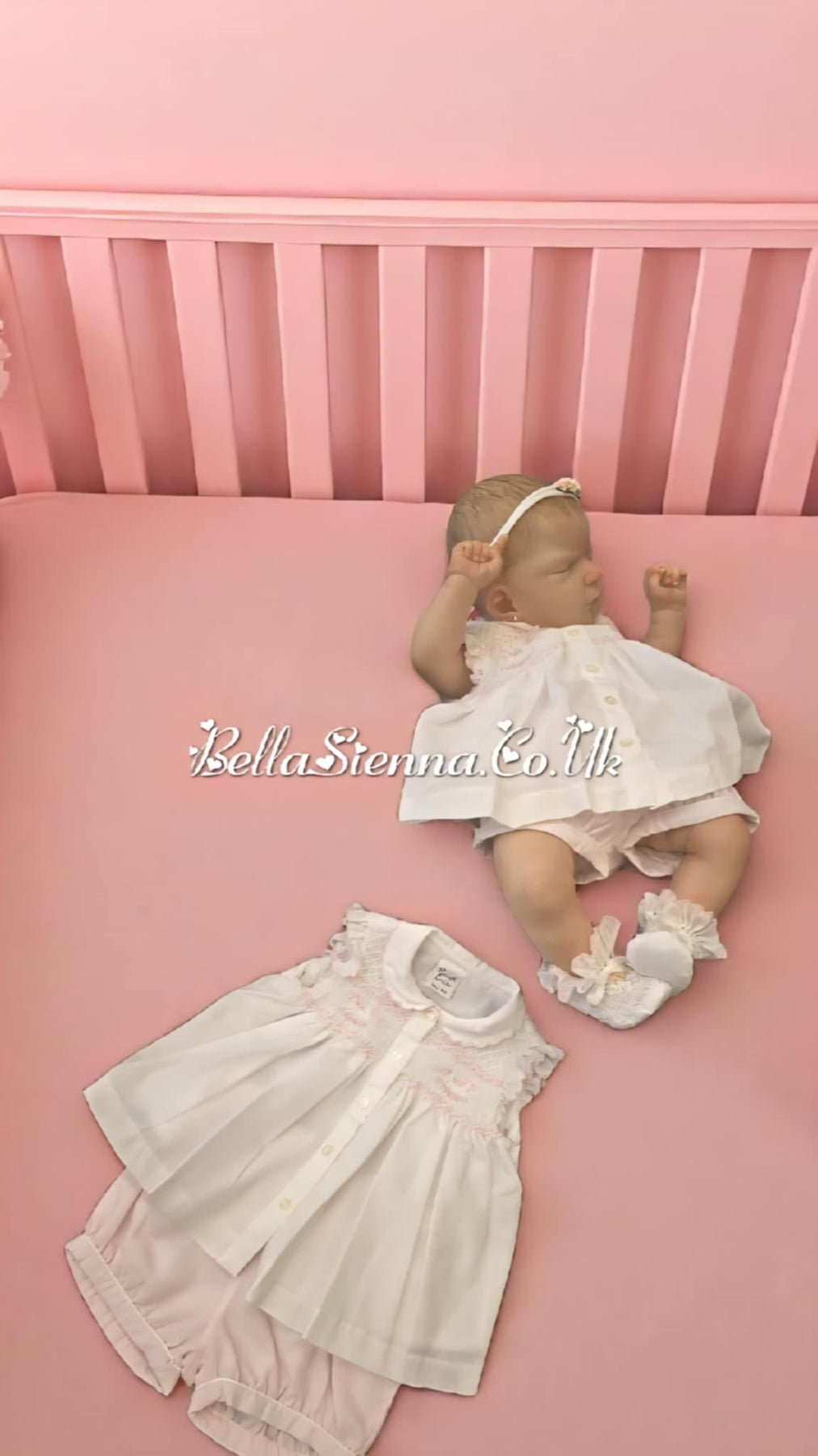 Traditional-style smocked outfit from British brand Sarah Louise. Super soft, lightweight white short sleeve collared blouse with adorable hand smocked yoke decorated with hand embroidered rocking horses, paired with matching lightweight pink shorts.