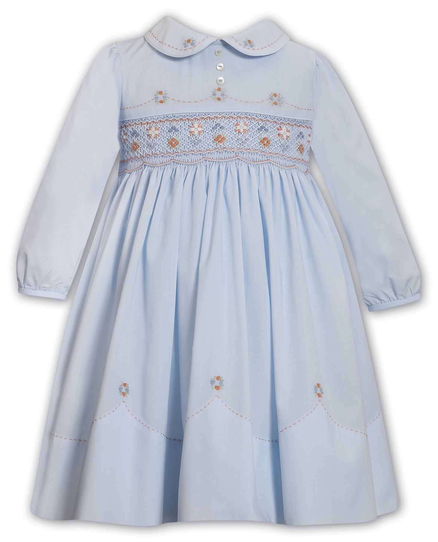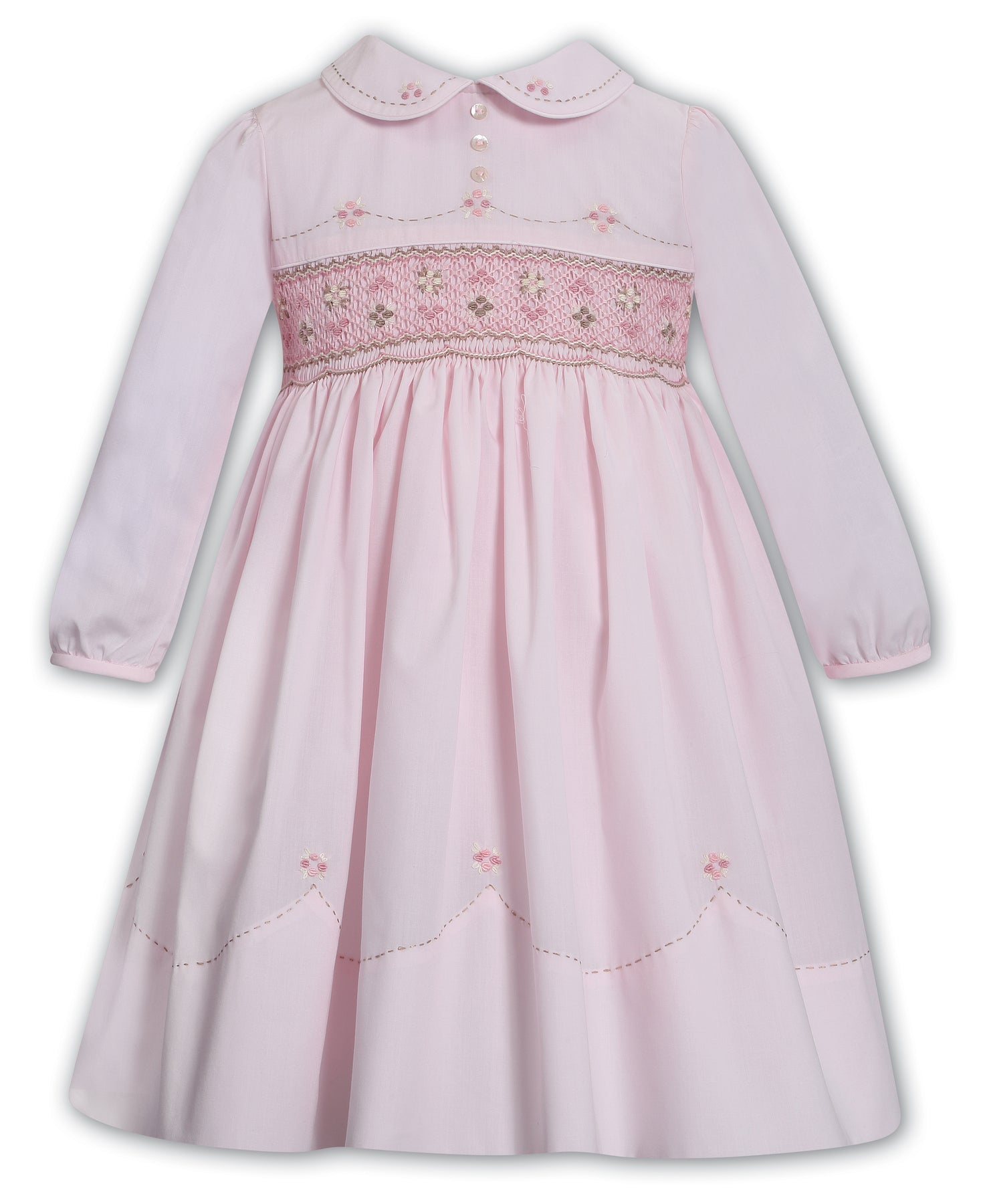 The sweetest dress for your girls wardrobe, designed in a soft pastel pink. The bodice is hand-smocked and delicately embroidered with floral detailing in soft rose and ivory with autumnal accents. Pearlescent buttons adorn the front, finished with a classic peter pan collar, a truly statement dress for your little princess.