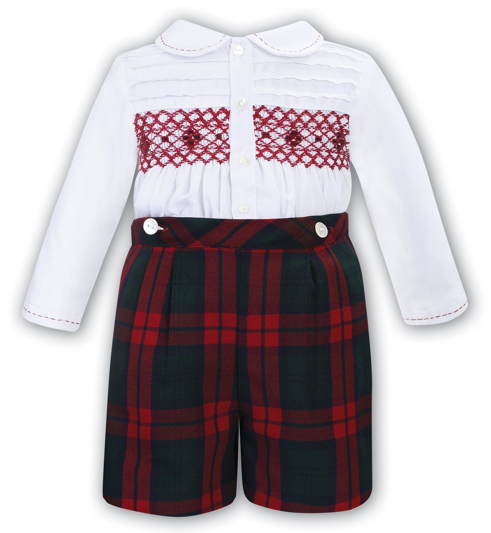Sarah Louise Boys White, Red & Green Tartan Hand Smocked Outfit - 013132