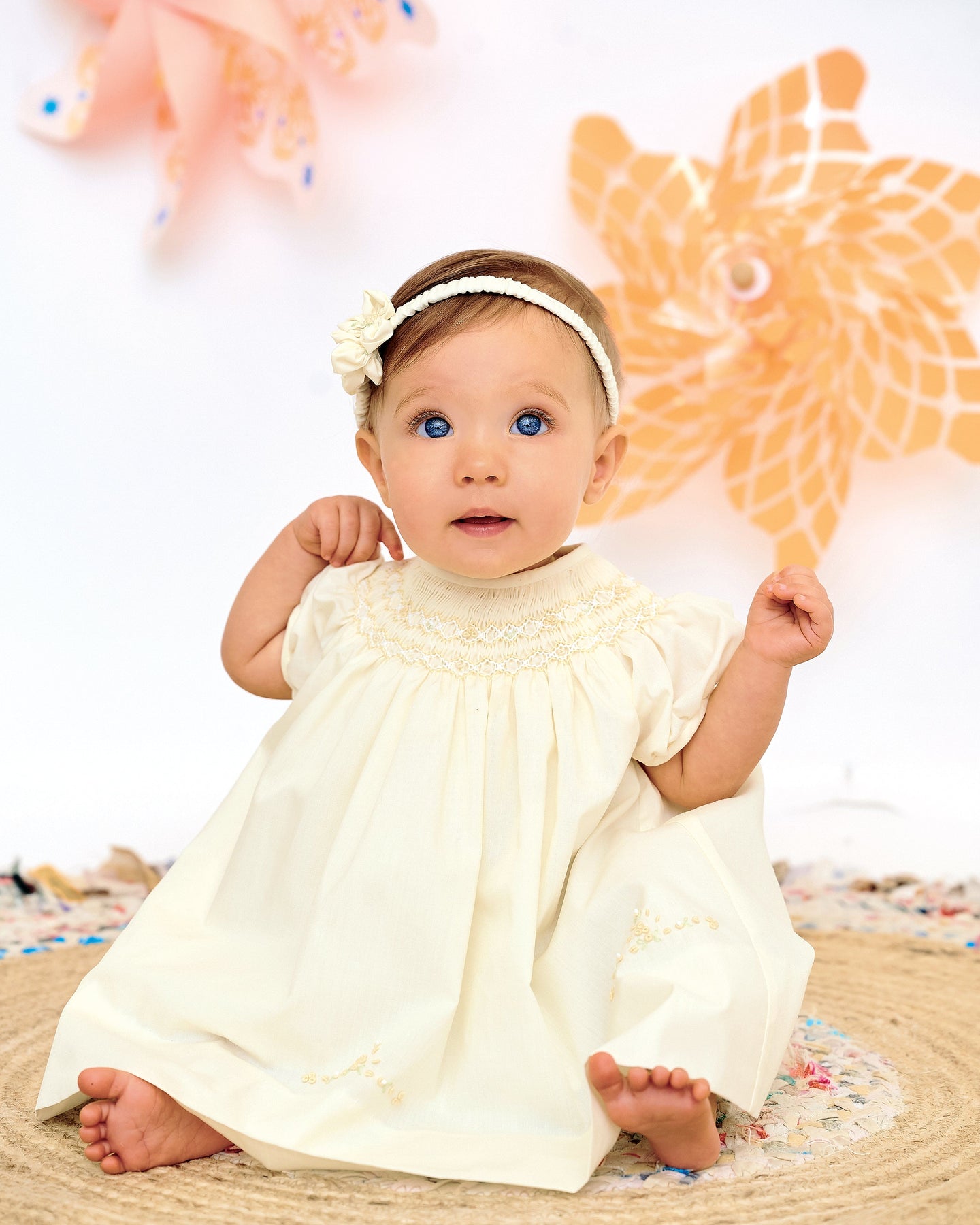The most elegant dress for your girls summer wardrobe, the neckline is intricately smocked by hand and adorned with tiny rose bullion flowers. Showcasing the finest needlework, delicate hand-embroidered flowers flow beautifully across the dress, finished with a coordinating head-band to complete the look.