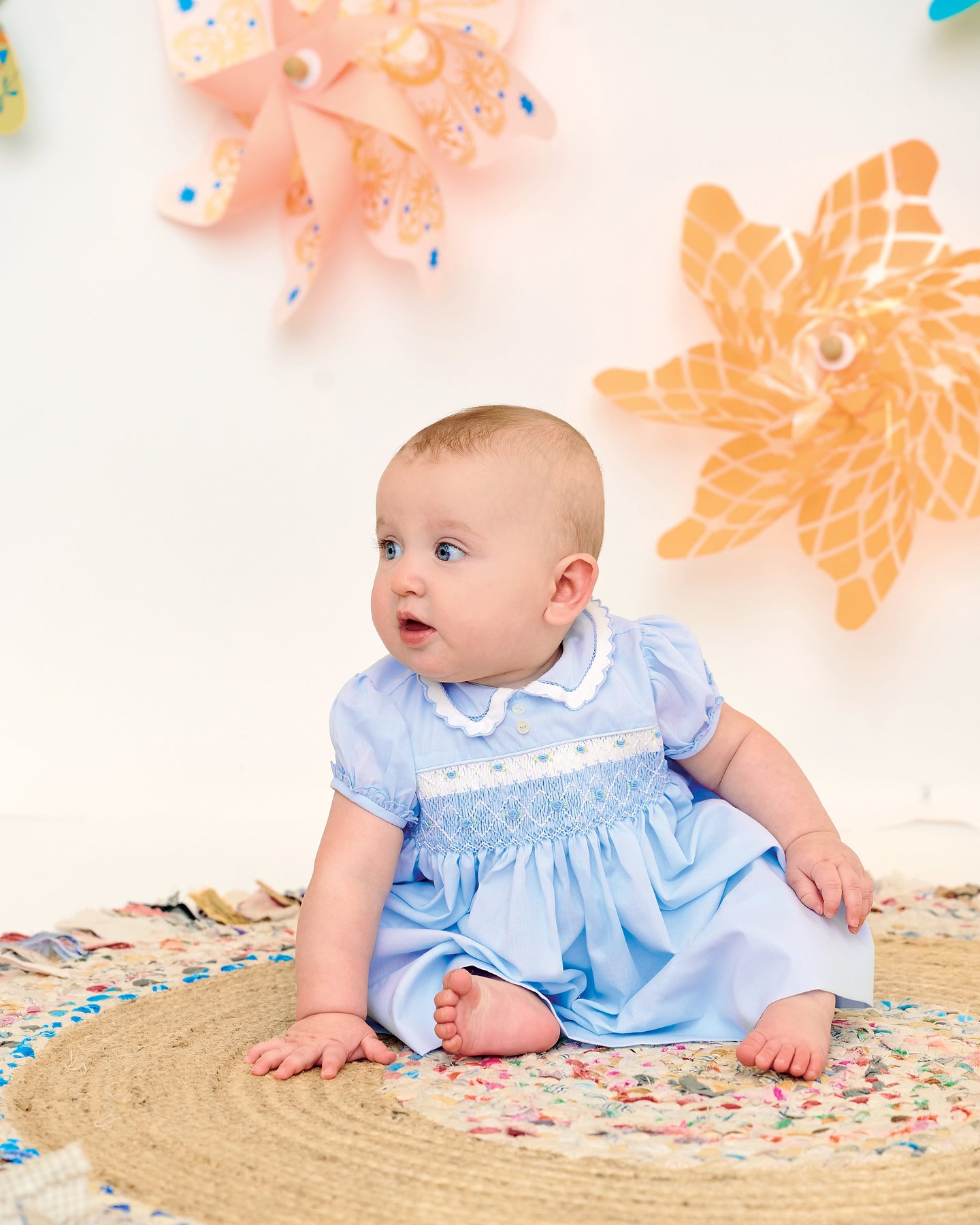 Your baby’s first dress, the epitome of timeless elegance. Delicately hand-smocked with a pretty soft white contrasting embroidery, tiny rose bullion flowers adorn the smocking. A classic peter pan collar and decorative buttons at the front, the dress fastens at the back with pearlescent buttons and a bow.