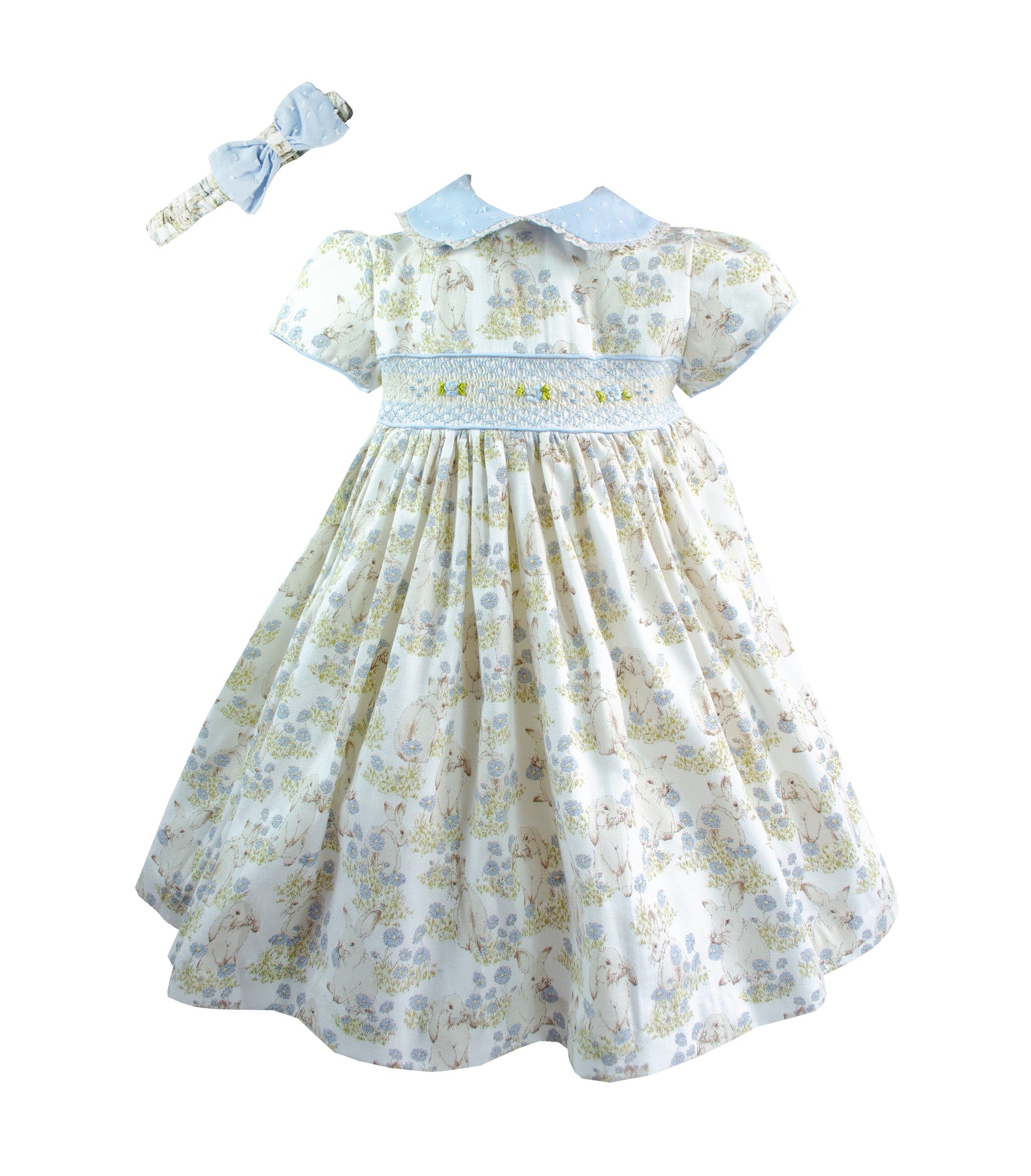 Pretty Originals Pale Blue Bunny Print Hand Smocked Dress & Matching Headband - MC01422
