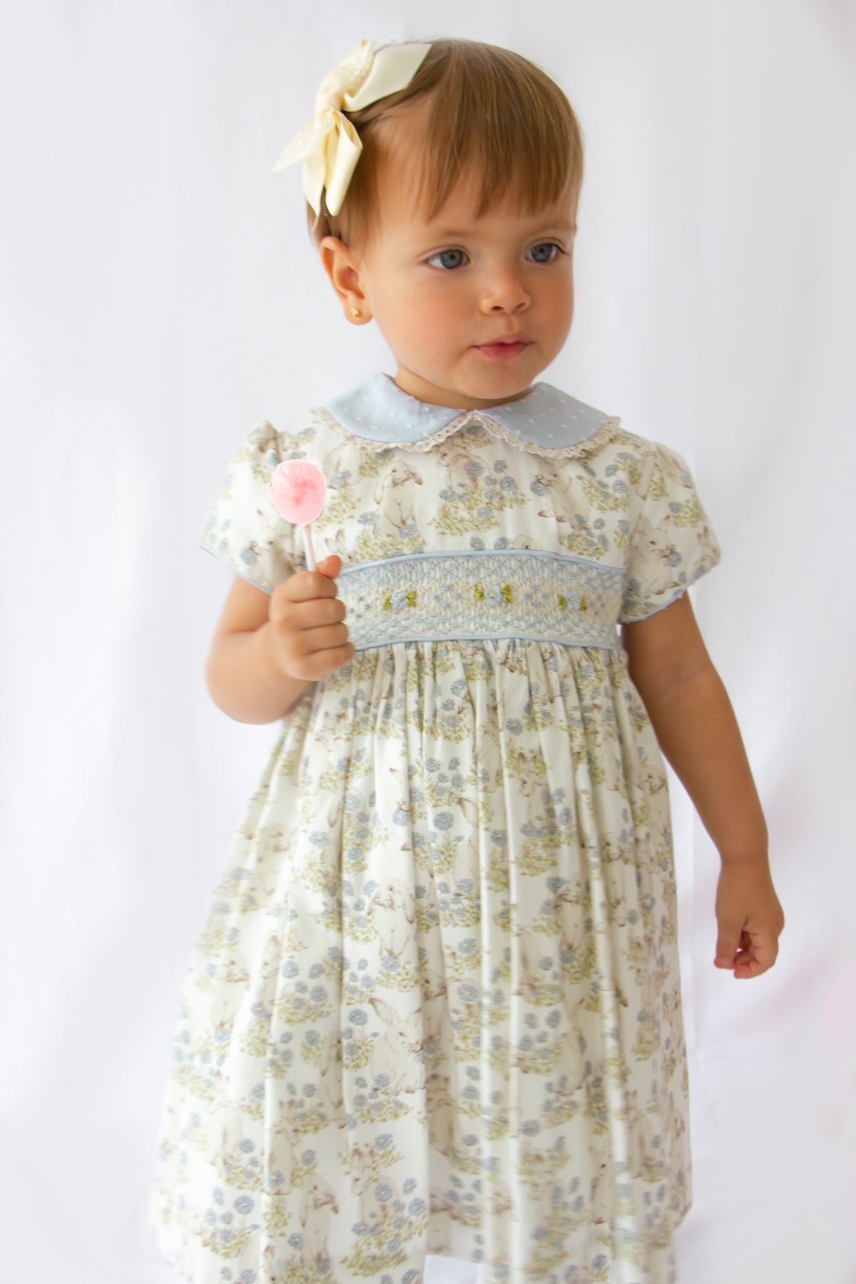 Pretty Originals Pale Blue Bunny Print Hand Smocked Dress & Matching Headband. The delicate hand smocking and charming bunny print, while the matching headband adds an adorable touch. Perfect for special occasions or everyday wear.