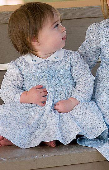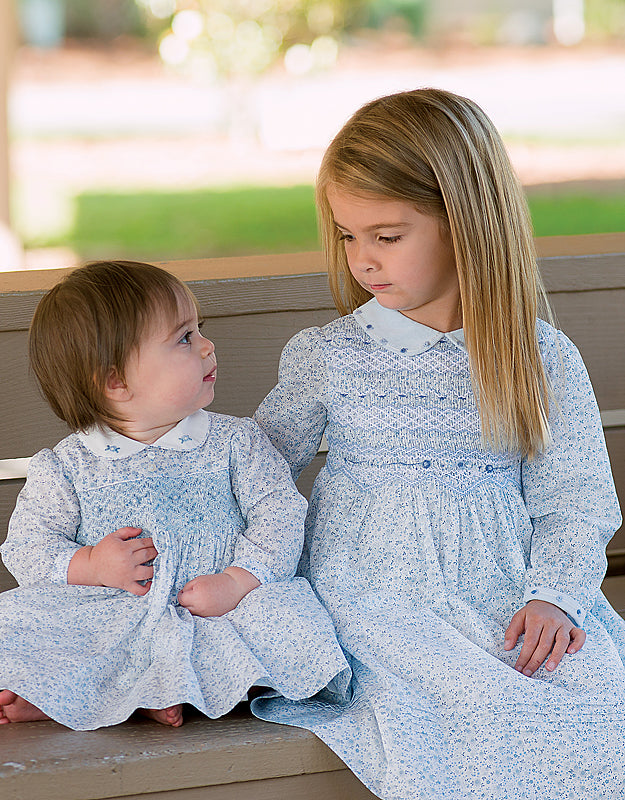 Sarah Louise Blue & White Floral Hand Smocked Dress -011318