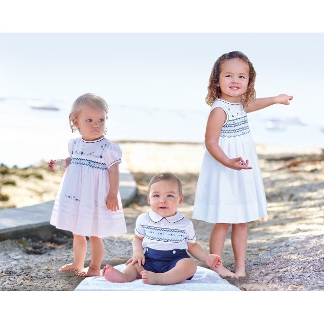 The Sarah Louise White, Blue, Navy & Yellow Smocked Outfit is perfect for your little ones. Made with soft, comfortable materials, this outfit features white, blue, navy, and yellow hues that complete its beautiful.