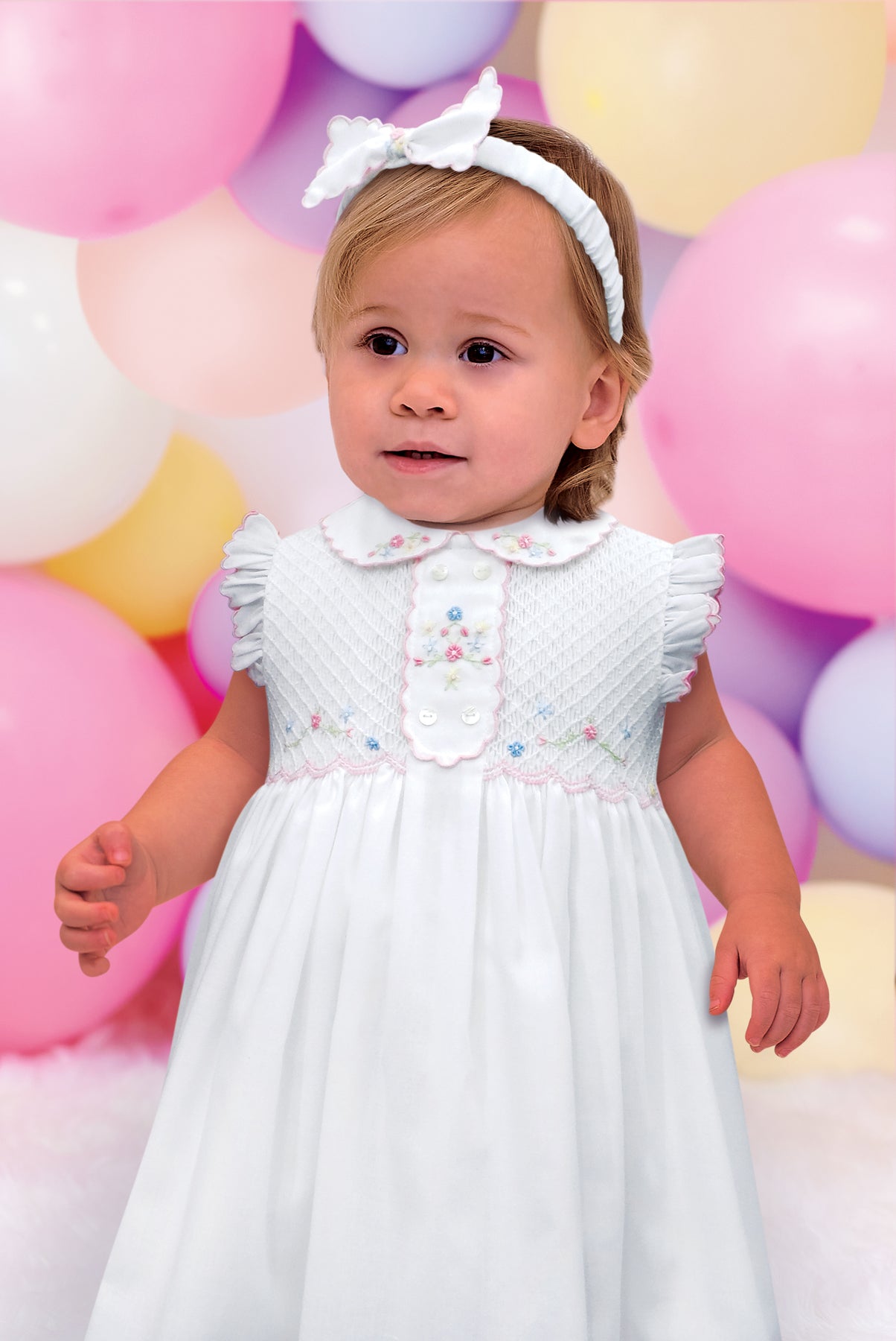 This gorgeous Sarah Louise dress flaunts a white background decorated with subtle blue, pink, and lemon detailing, featuring hand-smocked and embroidered floral accents and a coordinated headband.