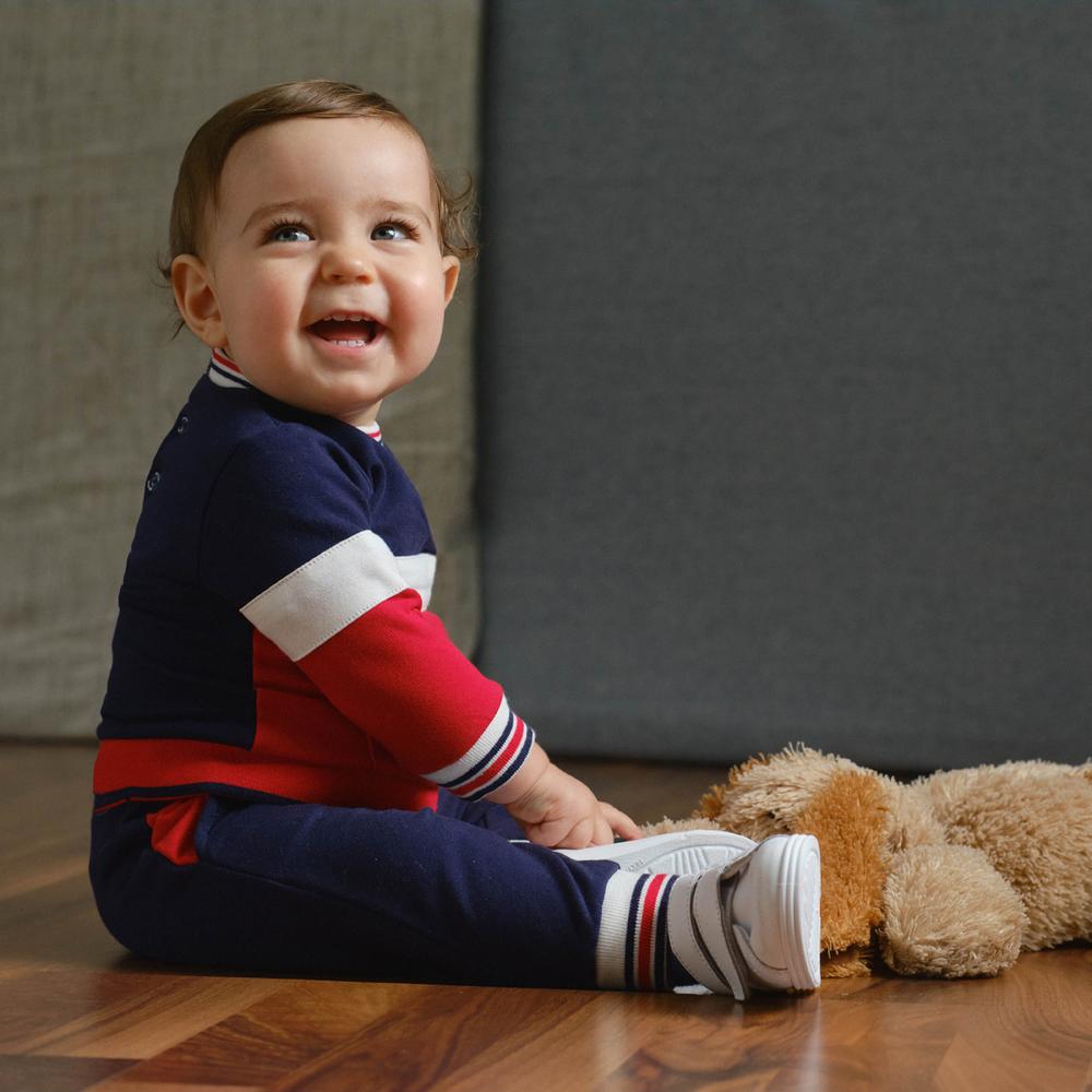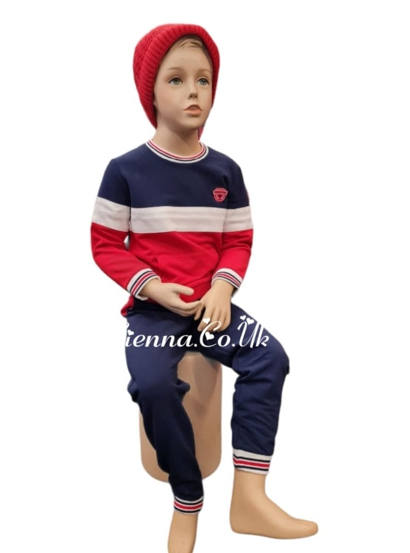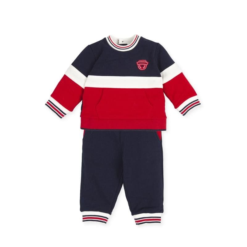 Navy, white, red tracksuit for little boys by Spanish brand Tutto Piccolo, made in soft and stretchy cotton jersey, with a warm and cosy fleecy inside. The top has white, navy and red stripe pattern across the front and on. The navy matching joggers have slanted front pockets, ribbed cuffs and a comfortable elasticated waistband.