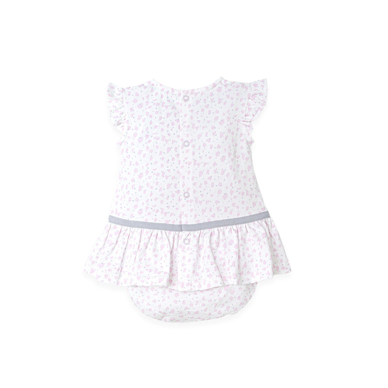 Patterned single jersey dress with embroidery and flounce. Back opening with pressure buttons. Briefs with elastic on waist and thighs.