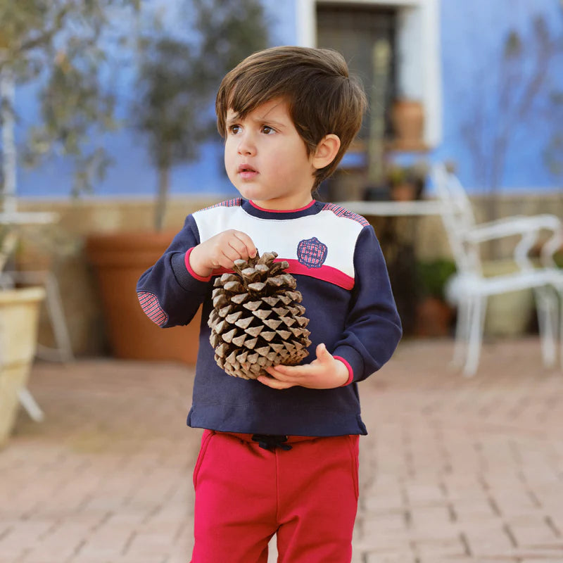White, red and navy tracksuit for little boys by Spanish brand Tutto Piccolo, made in soft and stretchy cotton jersey, with a warm and cosy fleecy inside. The top has white, navy and red pattern across the front and on. The plain red joggers have slanted front pockets, ribbed cuffs and a comfortable elasticated waistband.