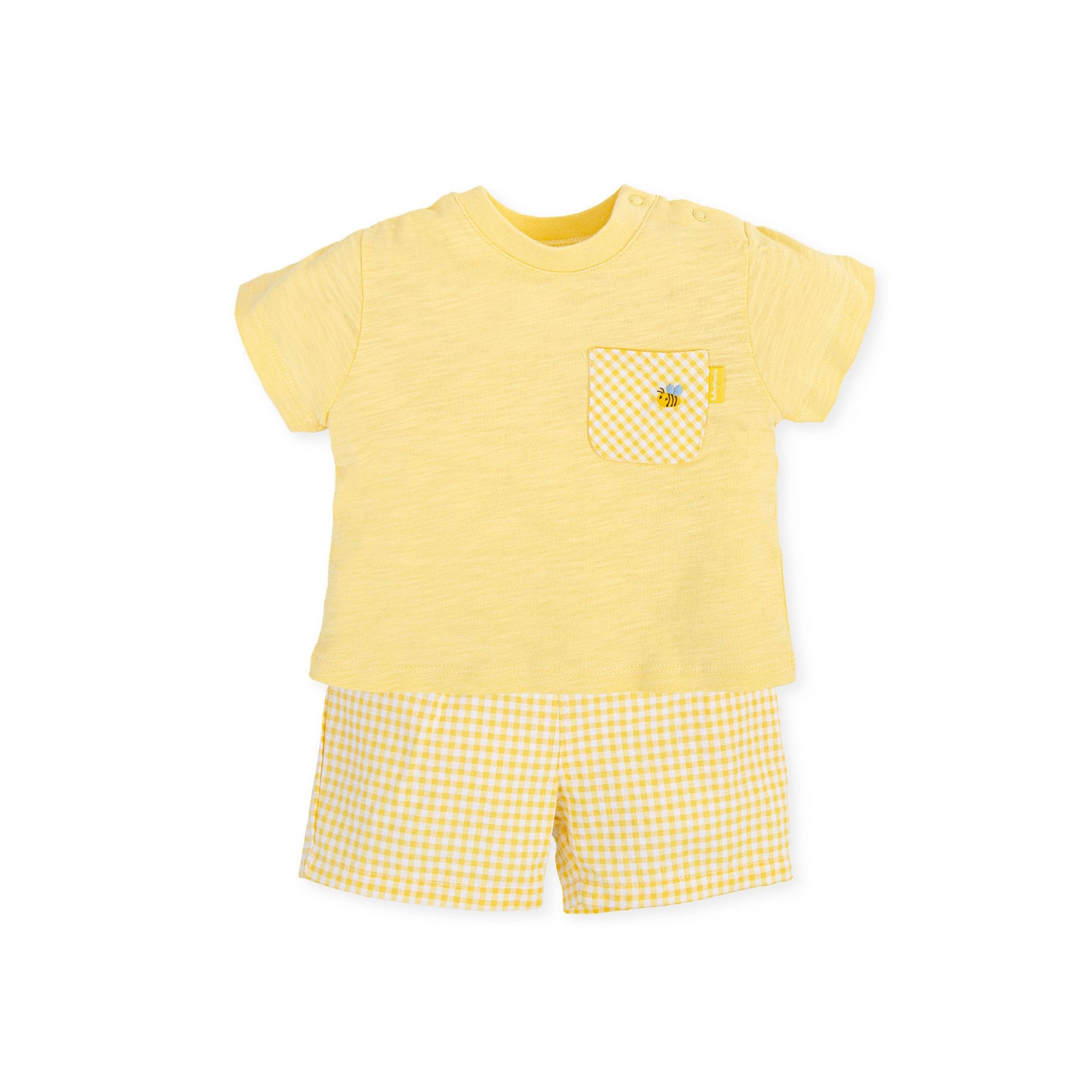 Tutto Piccolo Yellow Shorts & T-shirt Set. The t-shirt features a yellow hue, popper fastening and a pocket with an embroidered bumble bee. The shorts have a yellow check pattern and an elasticated waist for extra comfort.