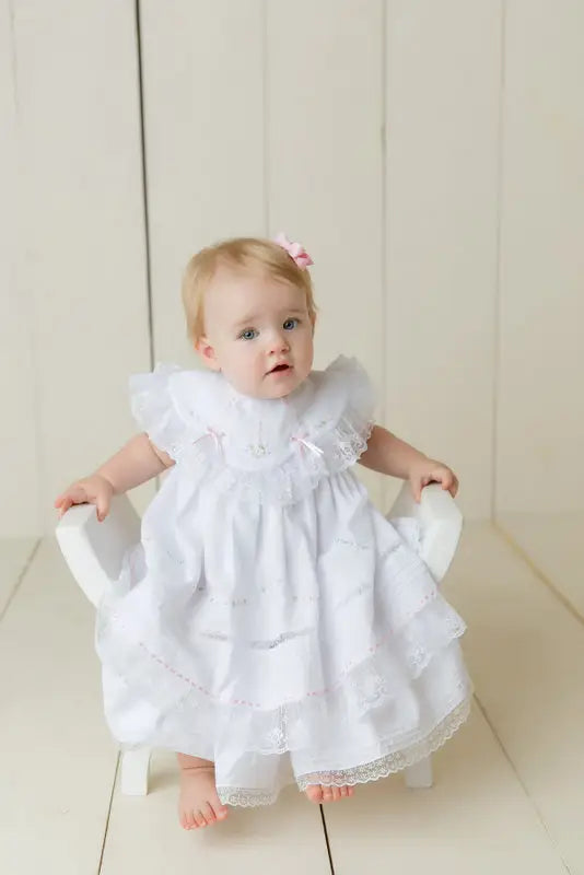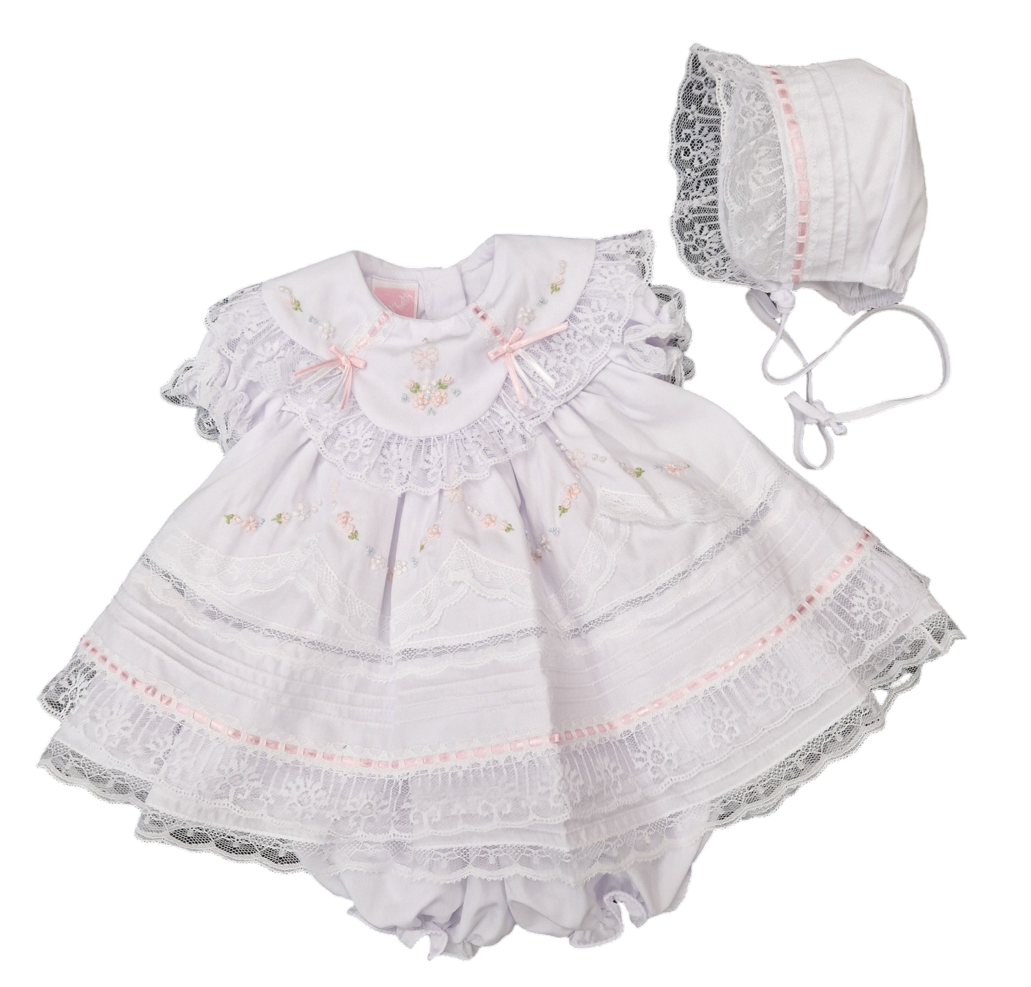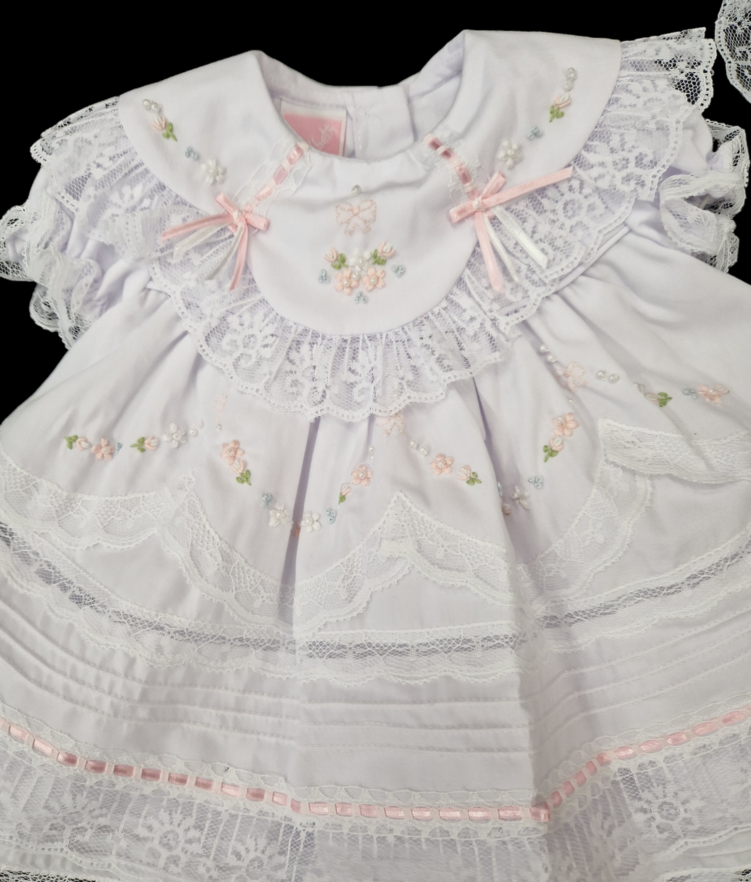 This beautiful dress has embroidered flowers in pink and white, with tiny white seed pearl accents.