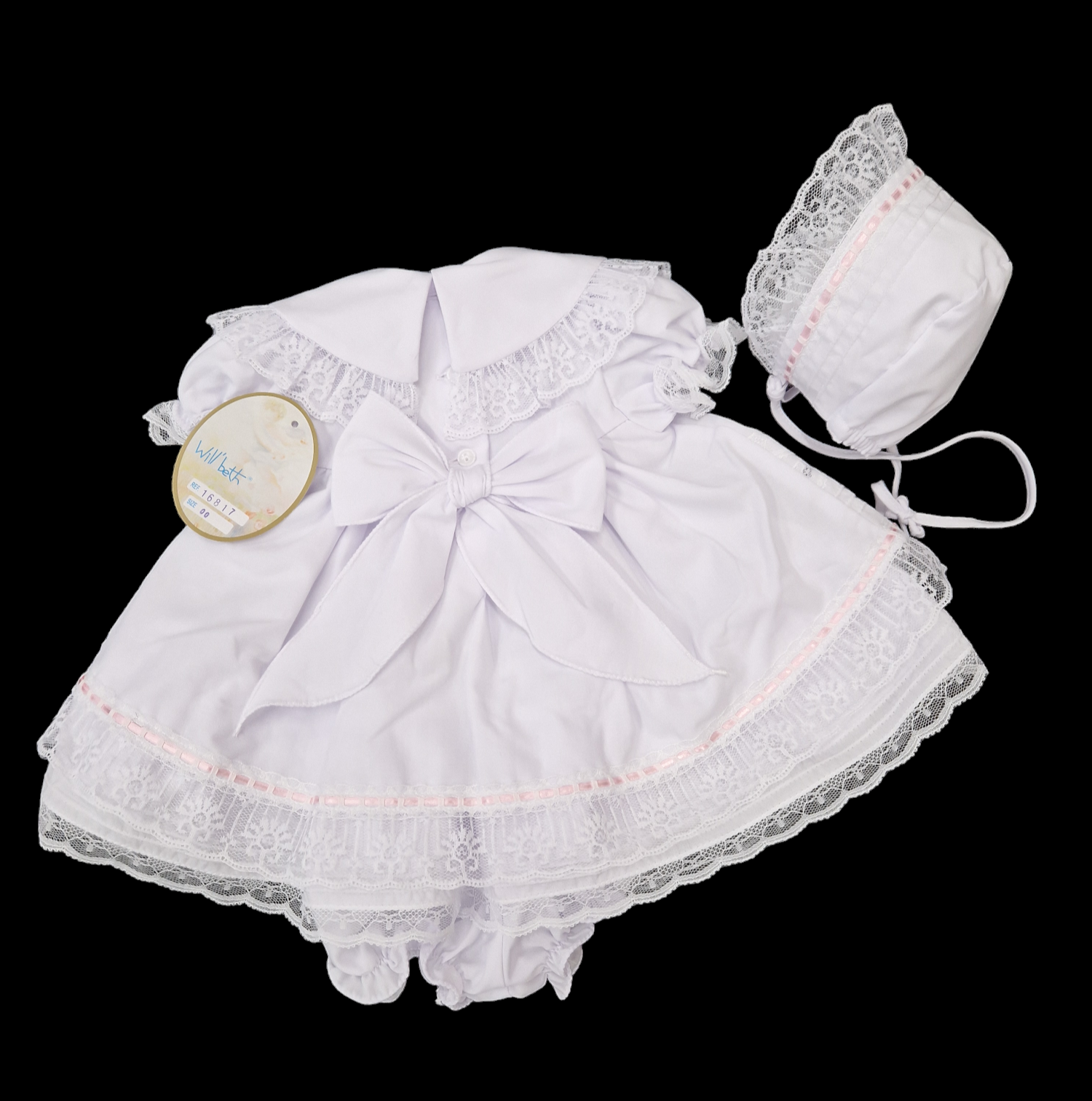 Beautiful heirloom style dress which has layers with delicate lace trim.