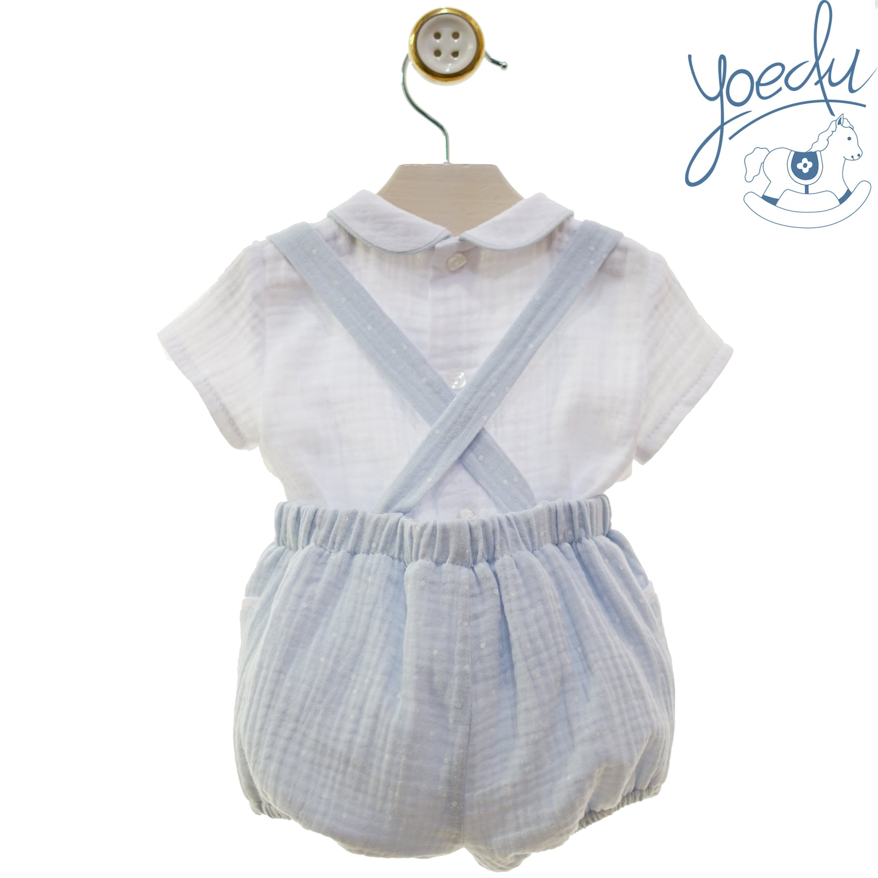 Yoedu Boys Blue & White Dungaree Outfit. Made with soft fabrics, this timeless outfit features a white shirt with a peter pan collar and pleating down the front of the shirt, perfectly complemented by blue dungarees with button strap fastening, its a classic design.