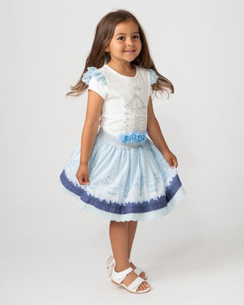 White and blue skirt set for girls by Caramelo Kids. Made from soft cotton and silky polyester. This set consists of t-shirt with ruffles on the shoulder, flower applique, embellished sparkling diamante, pearl beads and print of house on the front. Matching skirt with printed pattern details, an embellished rhinestones and sparkling silver elasticated waistband for a comfortable fit and the silky under layers have a tulle frill attached to add extra volume. Both has a broderie anglaise and scalloped trims.