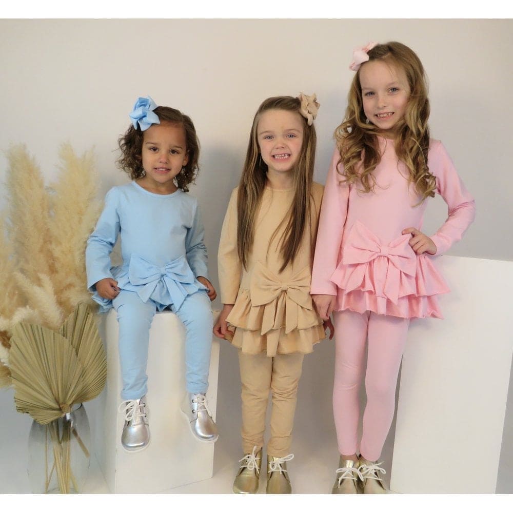 Our girls Hallie Beige loungewear set is perfect for them chilly days, this set has two layers of frills to promote a skirt look around the bottom of the top it is finished with a large bow on the front, these sets are made from 100% cotton so you an assured of the highest quality and no bobbling!