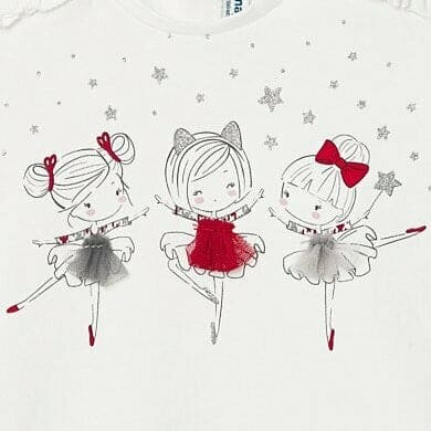 Long sleeved t-shirt for baby girl. Round neckline. Snap-button fastening on the back to allow the garment to be put on easily. Made from soft elasticated cotton fabric. Decorative elements: decorative applique, design on the front, glitter.