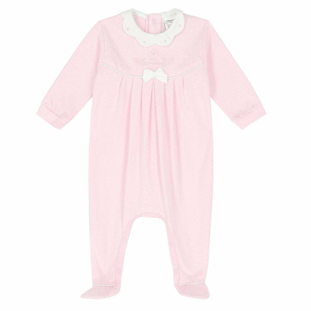 Baby girls pink logo babygrow by Tutto Piccolo. Made from soft cotton, it features a allover white dot print and embroidered logo and floral detail on the chest.. It has a white collar with a pink dots and white bow and white trims on the front. Popper fastening at the back and between legs for easy dressing.