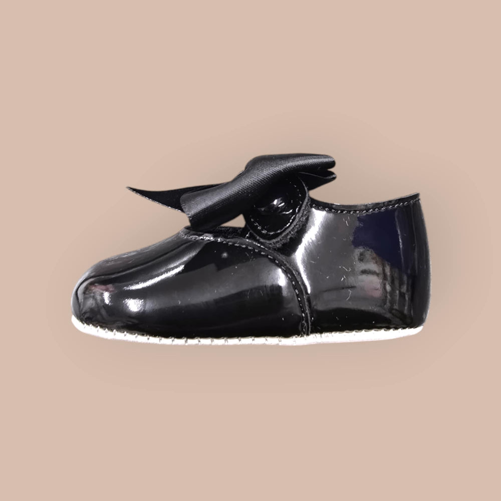 Baby girls black patent pre walker bow shoes. Made from polyurethane. Soft sole pram shoes. 100% cotton lining and insole.
