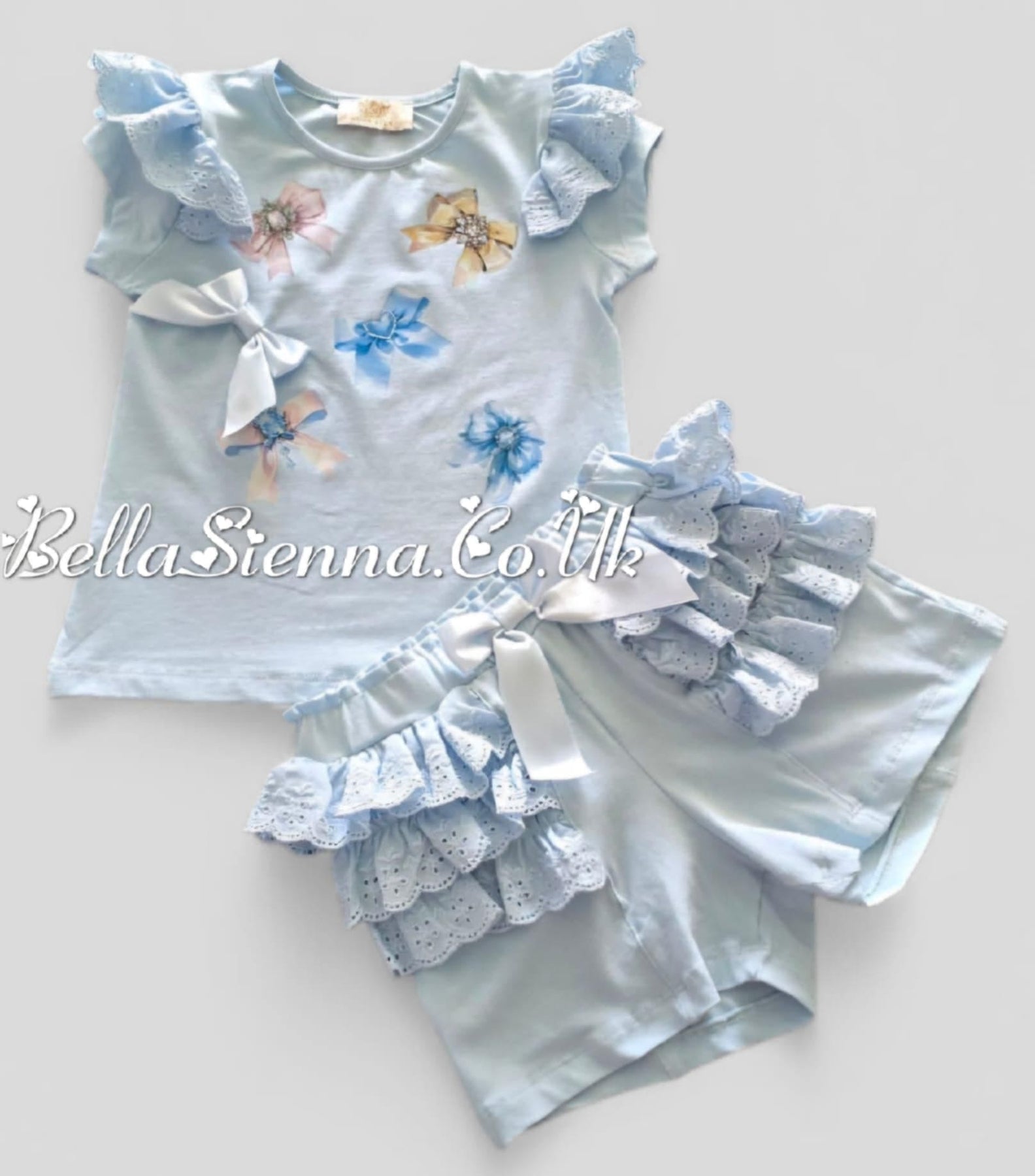 Blue "Bow" Anglaise Frilly Shorts Set - S215