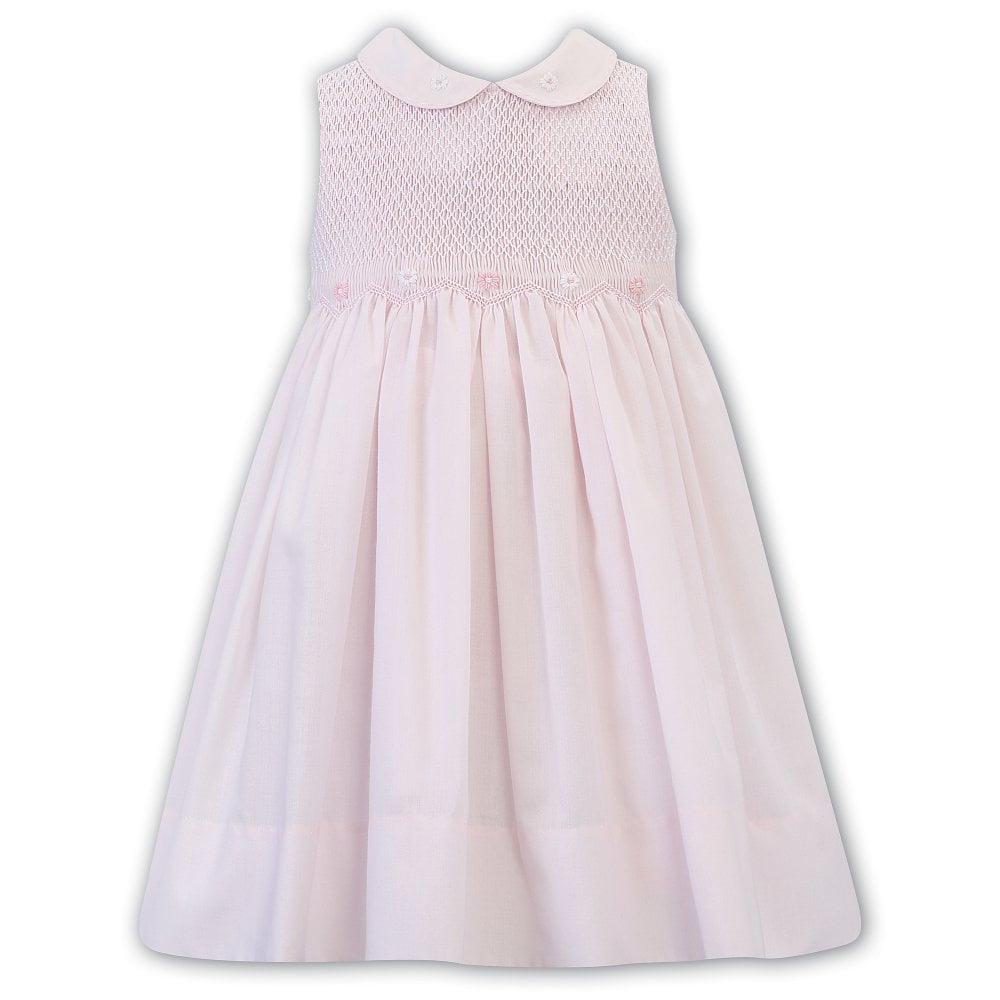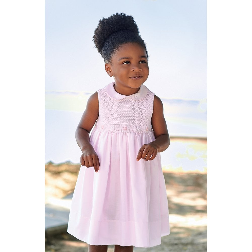 Discover the Dani By Sarah Louise sleeveless summer dress, expertly hand-smocked with embroidered flowers for a delicate and timeless look. Made with the finest artisanal needlework, this pastel pink dress is perfect for coordinating with younger and older siblings. Elevate your girls' wardrobe with this charming dress.